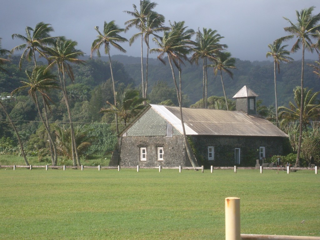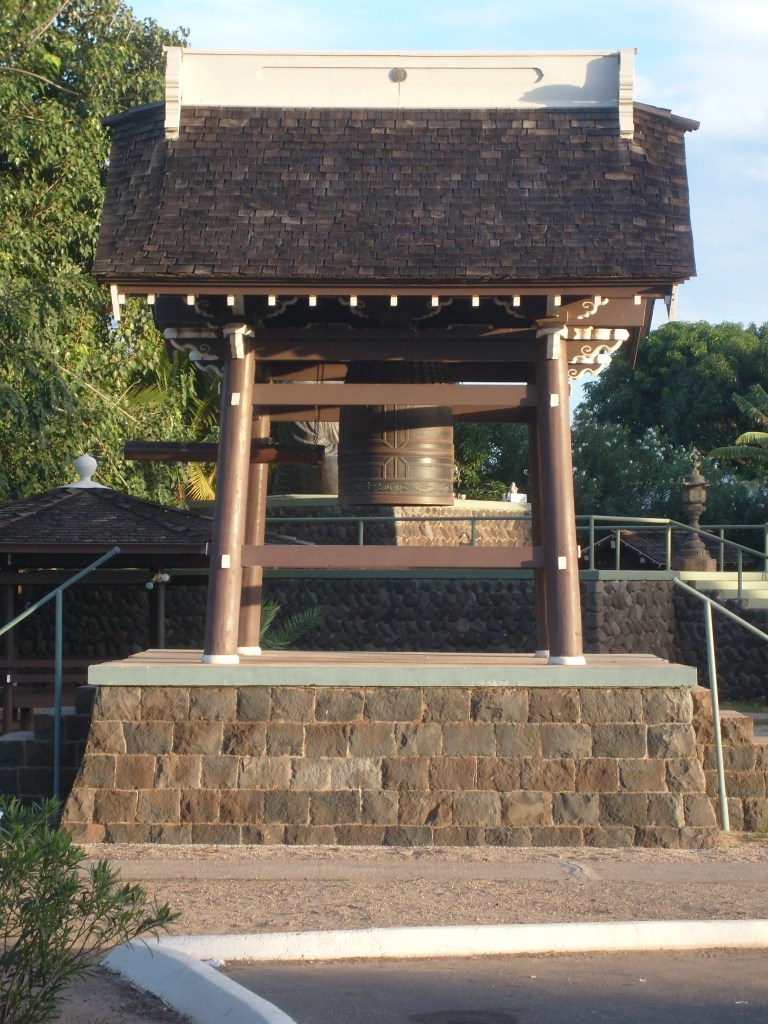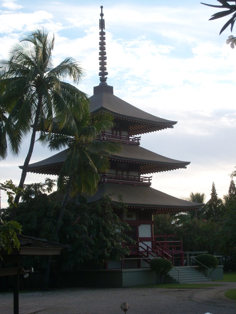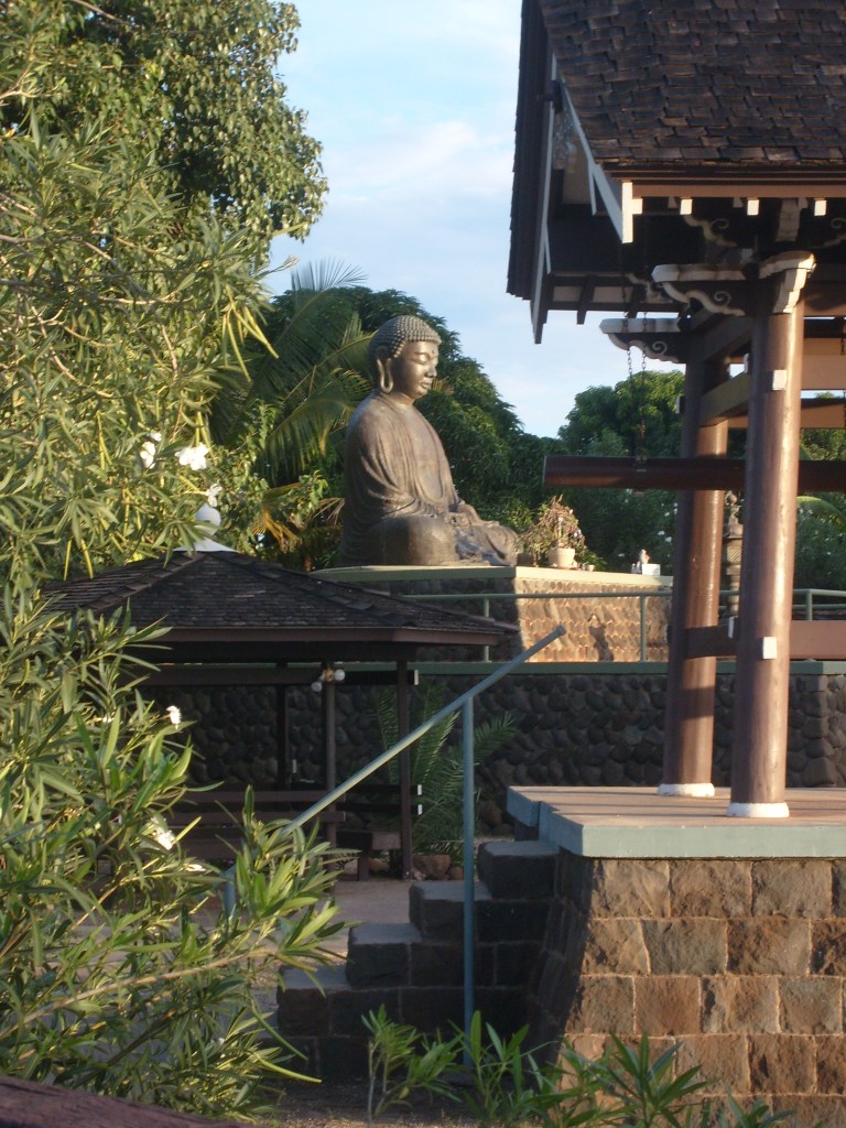 At Maalaea I boarded a boat and rode out to Molokini Crater for some snorkeling. It was enjoyable, but I would advise against it. The water at Molokini Crater is just too deep for snorkeling. Most of the fishies are so far below you that you can barely make ’em out. I imagine it would be a great place for SCUBA diving, but if you’re looking specifically for snorkeling, try to find a place where the water is much more shallow. As we were headed back to the dock, we spotted some humpback whales breaching in the distance; nothing close enough to photograph with the cheap old camera I had with me. Once I was back on land, I continued to the town of Lahaina, where I found a Buddhist mission…
