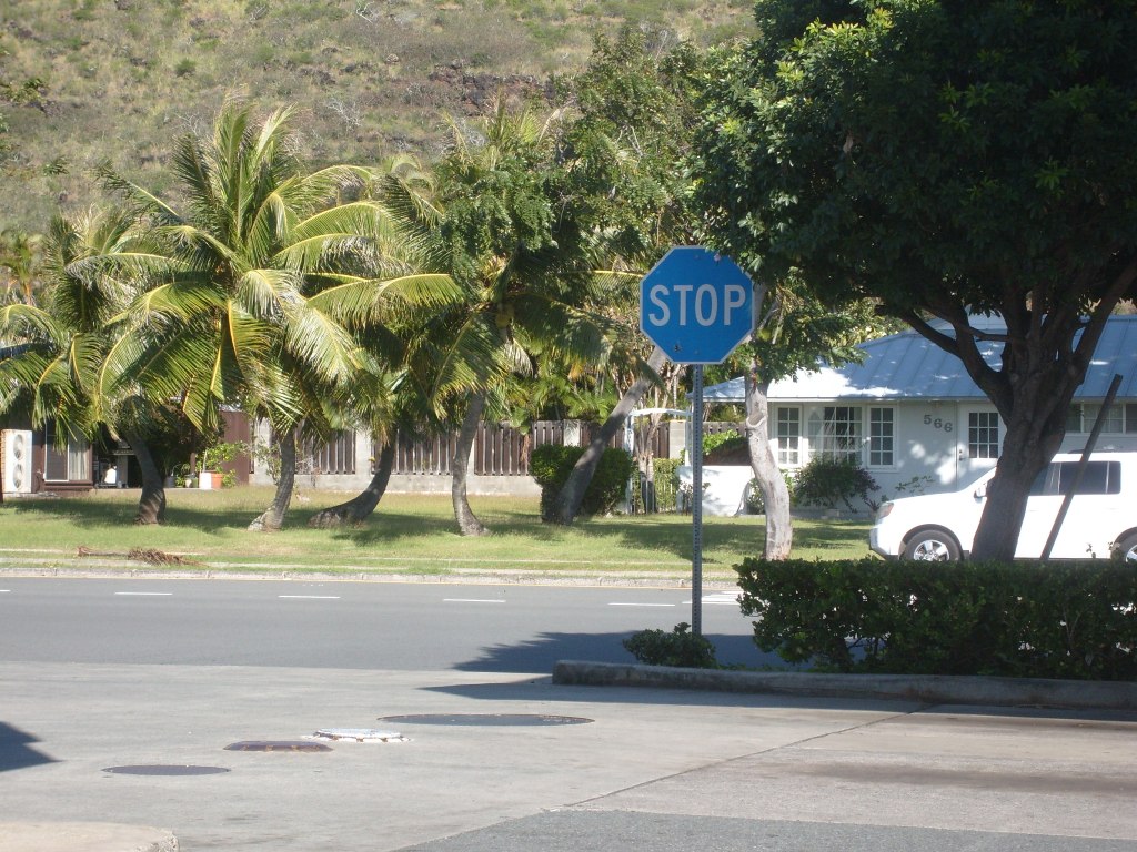 On my back from Manoa Falls to my Final Hawaiian Destination, I had stop for a stop sign. That doesn’t mean what you think it means. I mean I had to stop to photograph a stop sign. Y’see, for some reason, Honolulu is The Land of Blue Stop Signs.
