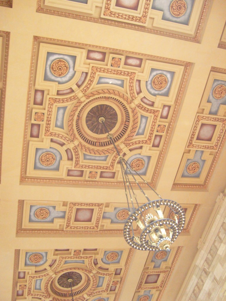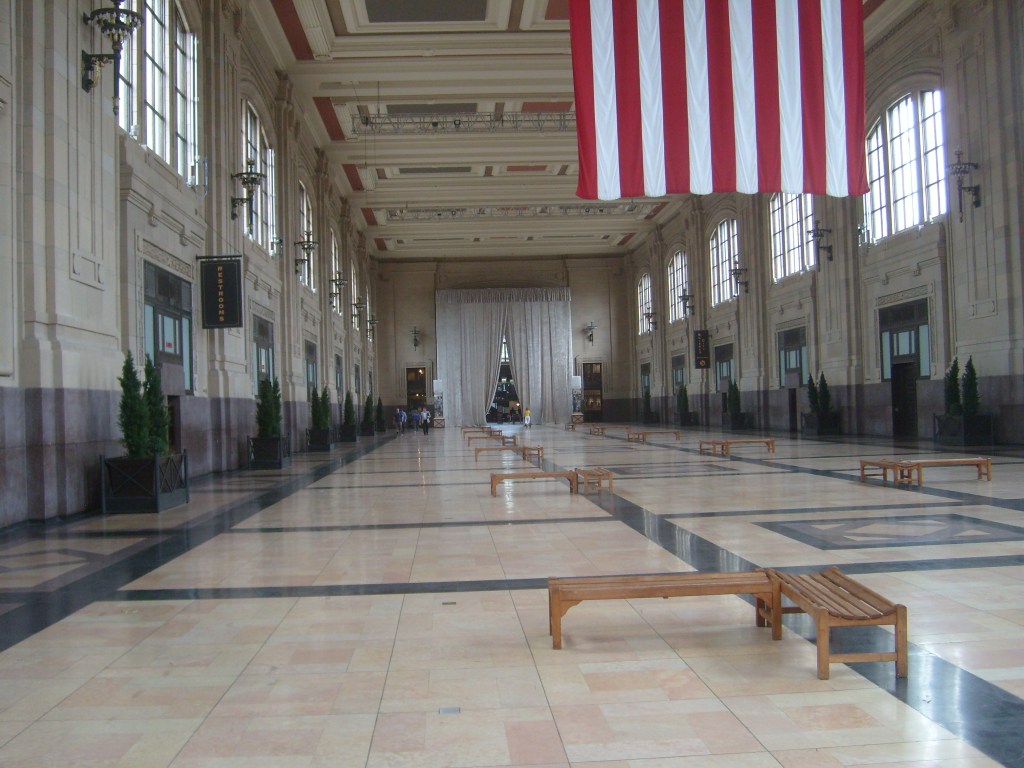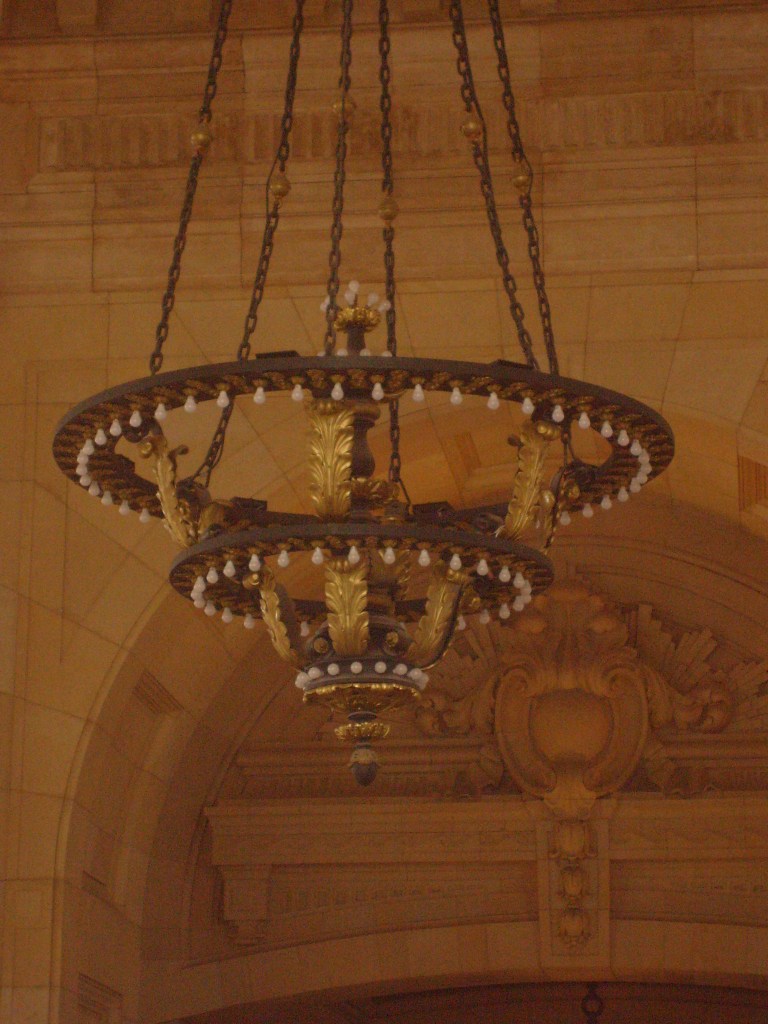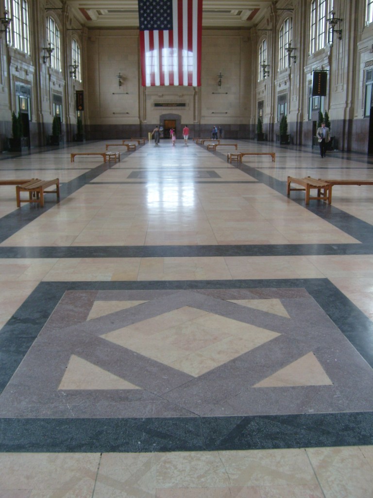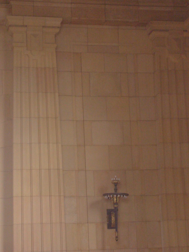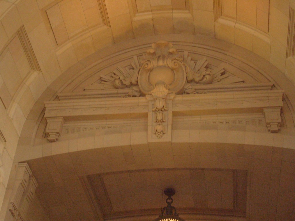 I don’t know what year this part of the building was added, but it’s not original.Aerial view of terminal. Everyone parked as far as possible from the Tyrannosaurus.I pledge allegiance to The Time!For a sense of how colossal this place is, look for the grown man in blue.This is actually inside the terminal.Ornate ceiling inside the terminalThe ceiling inside the terminal is ornate and extremely high. But how high is it?…the top of this photo isn’t even halfway to the ceiling……the arch in the background gets pretty close to the ceiling……and these humans give you somewhat of a feel for how high the arch is.Detail of the aforementioned archPassing through the arch takes you from the terminal to the concourse.While not as intricate as the terminal ceiling, the concourse ceiling is cool too.From the other end of the concourseOne route was called the Flying Crow. Does that mean it was a straight line?Random ornateness around the station…