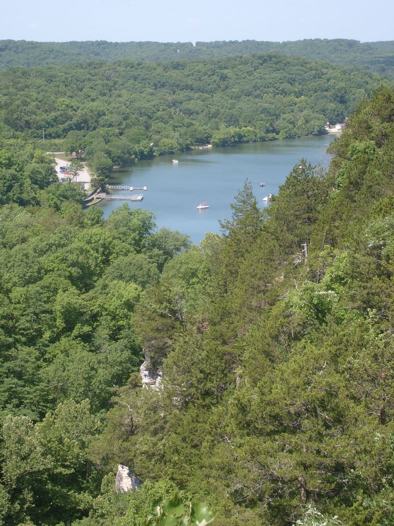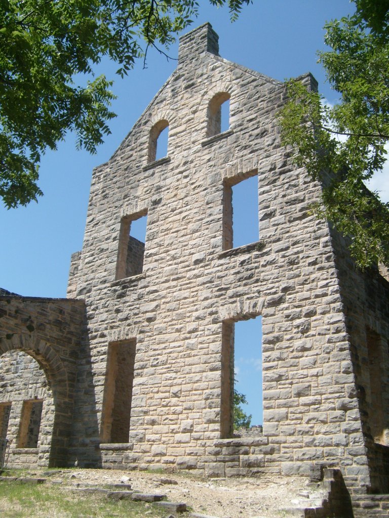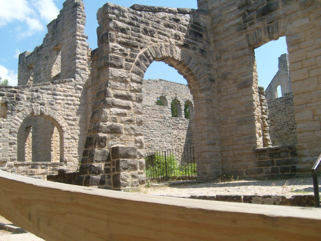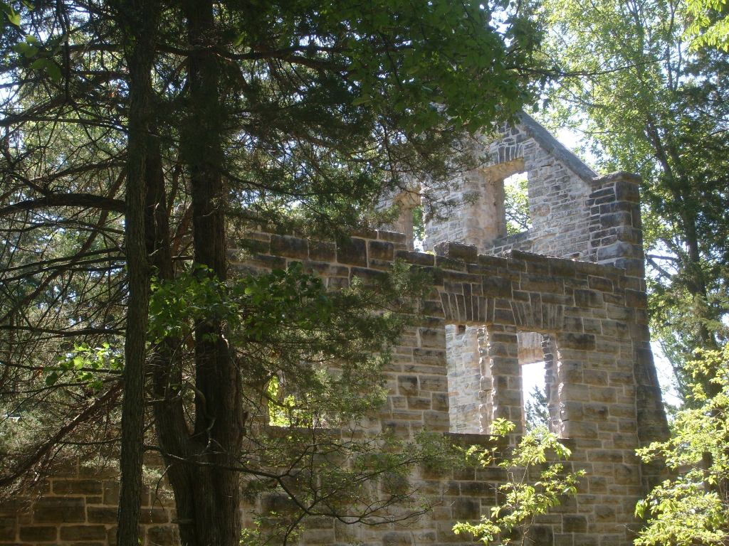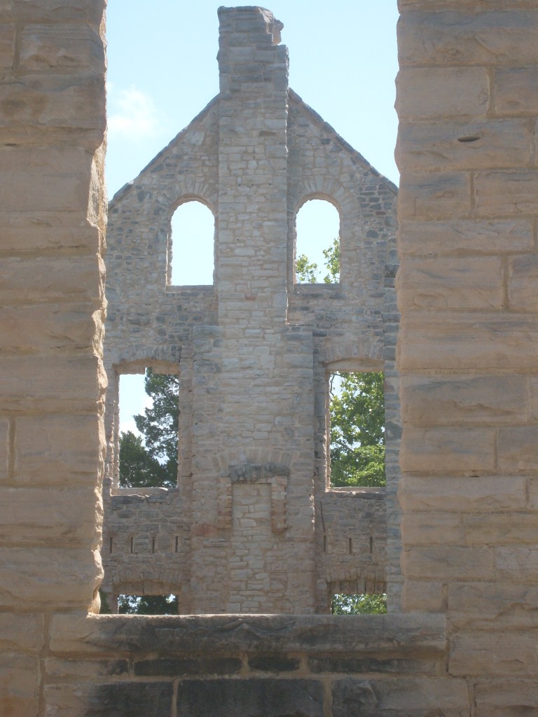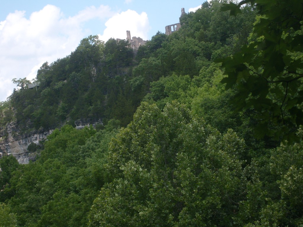 The following day I went to Ha Ha Tonka State Park. Yes, that’s its real name. This is a park with (at least) two distinct environs: low/wet and high/dry. I started with the high and dry, specifically the top of a bluff overlooking a small arm of the Lake of the Ozarks. The main draw here is the Ha Ha Tonka Castle Ruins. Completed in 1922, this “Castle” was actually a European-style mansion built for the family of a successful Kansas City businessman. In 1942, the mansion was gutted by a fire. All that remains of the mansion are its massive stone walls…