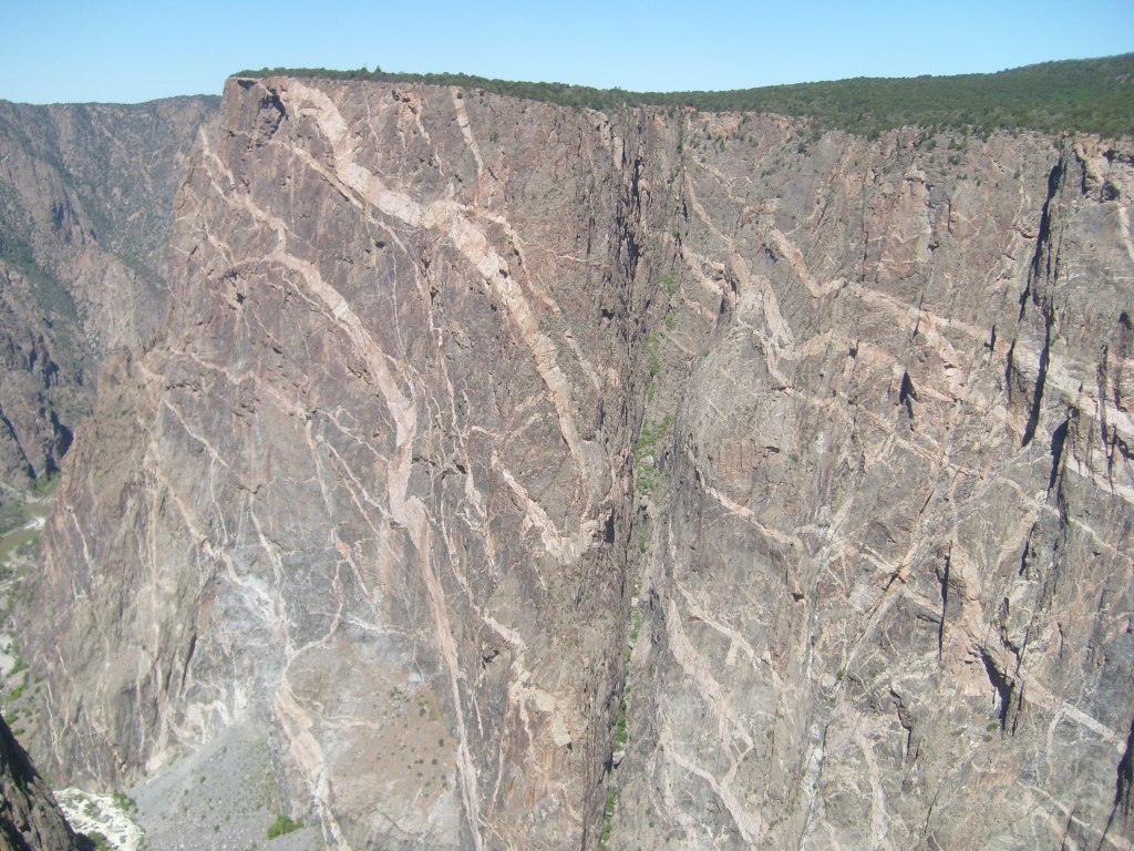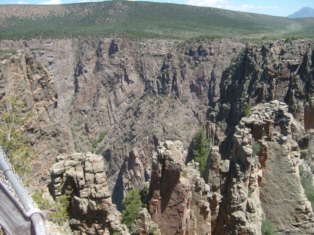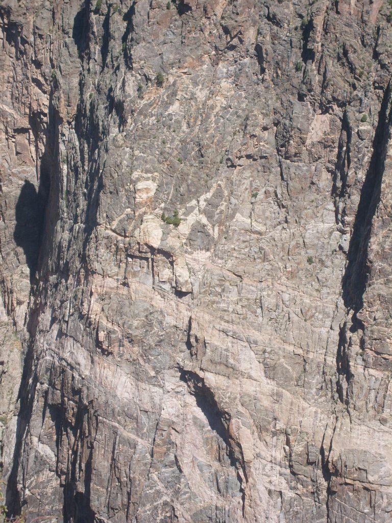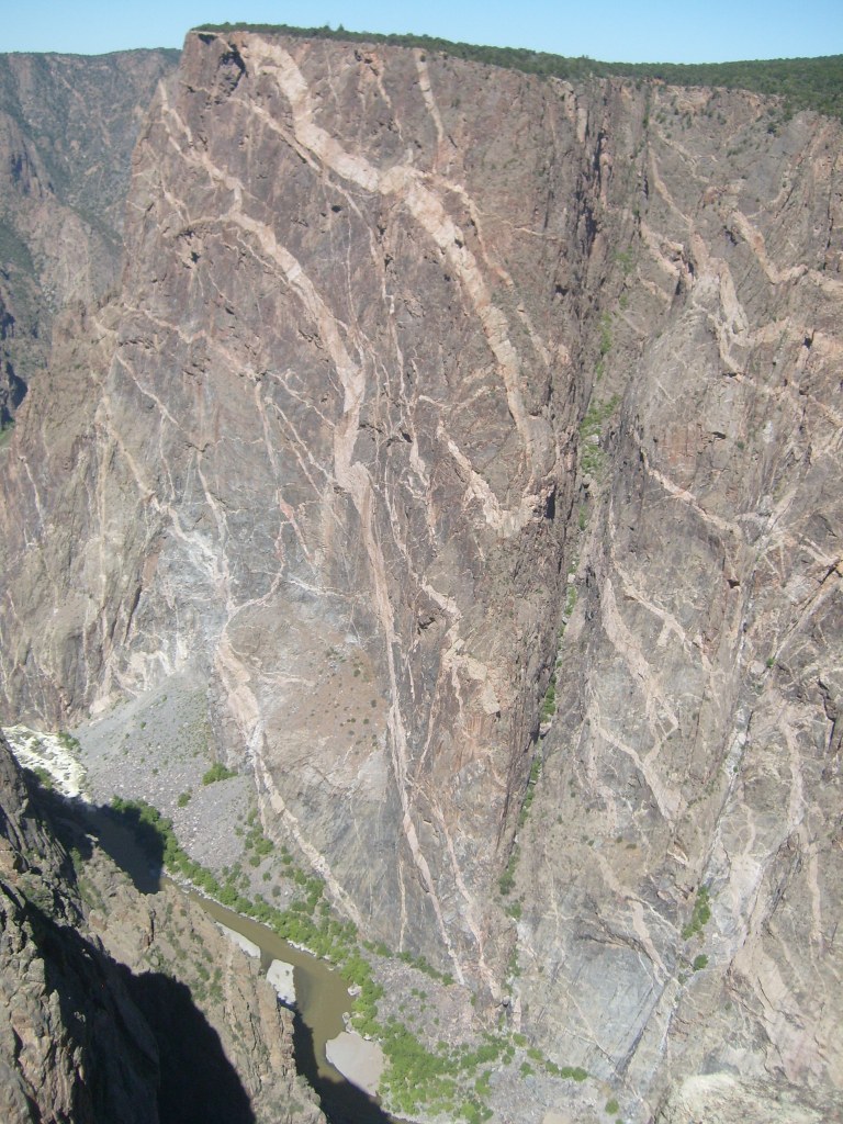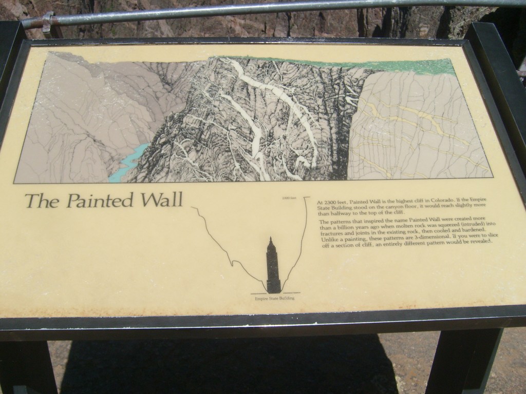 Painted Wall is awe-inspiring, in beauty & size, but size is hard to gauge in this shot……so I rotated the camera, hoping the river at the base would give a sense of scale……if you’re still not awe-stricken by the size of Painted Wall, then read this sign. Rapids on the Gunnison River, nearly half a mile below the photographerNever seen a railing installed quite like thisDetail of the Painted Wall, Black Canyon of the Gunnison National Park, Colorado