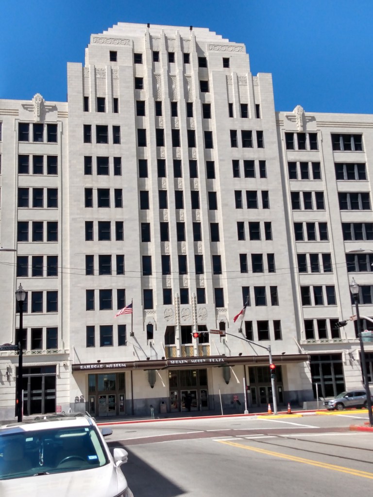 The plan for today was to visit the Galveston Railroad Museum, then probably Galveston Beach. I had never been to Galveston so, much like San Antonio just a couple days ago, it had not occurred to me that I should allow for ogling various buildings. But on this day, I actually left my camera at the hotel (40 miles away). So I had to beat myself up a bit when I saw the cool Art Deco railroad station that houses the Galveston Railroad Museum. A subsequent beating had to be performed when I discovered Galveston has a much larger downtown than I had guessed, and that it’s loaded with picturesque 19th and early 20th Century buildings. But I couldn’t let the train station go unphotographed, so I snapped a few pics with my phone…