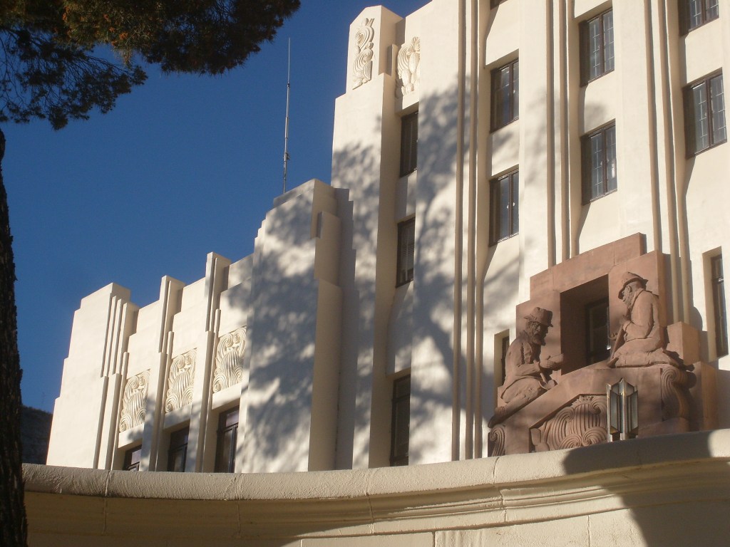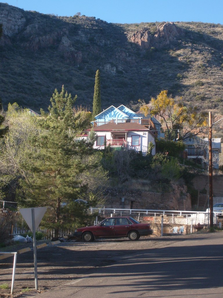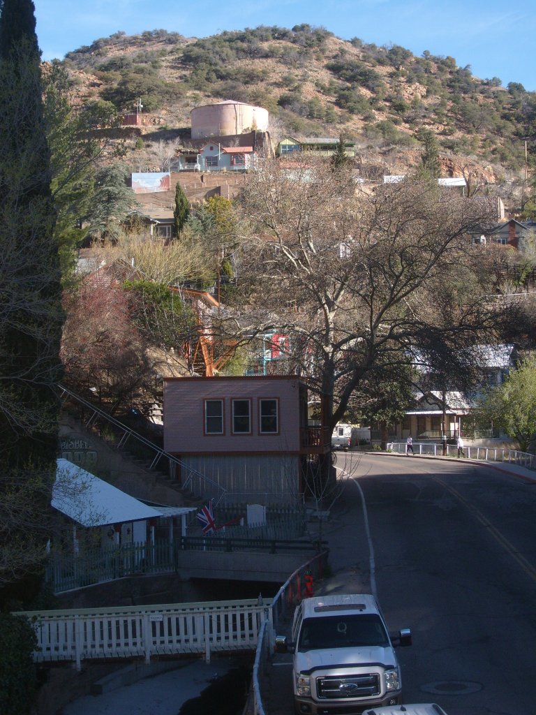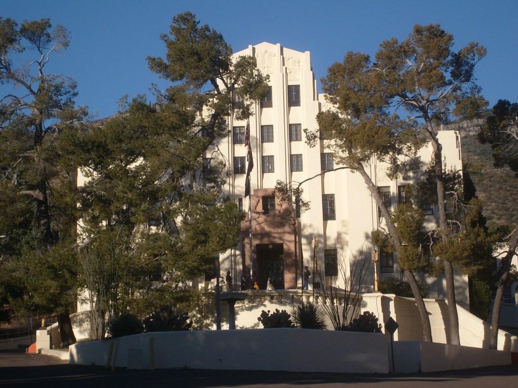After spending a night in Tucson, we wandered down to the town of Tombstone (TOOM-stoan) – probably the most notorious town of the Old West, site of the fabled shootout at the OK Corral. I didn’t take any pictures at Tombstone; just enjoyed the history. There’s quite a bit to see and/or do here, including the old county courthouse, which is a museum these days. Inside this museum, I learned (among other things) that Tombstone was the county seat until the mid-1930’s, when the county government was moved to the town of Bisbee. Now I knew nothing about Bisbee at this point, but my friends had already planned on taking me there for our next overnight stay. So now I’m thinking…if they moved the county seat…then they probably would have built a new county courthouse at the new location…and it was the 1930’s…so what sort of architecture might it have…? I began to get my hopes up.