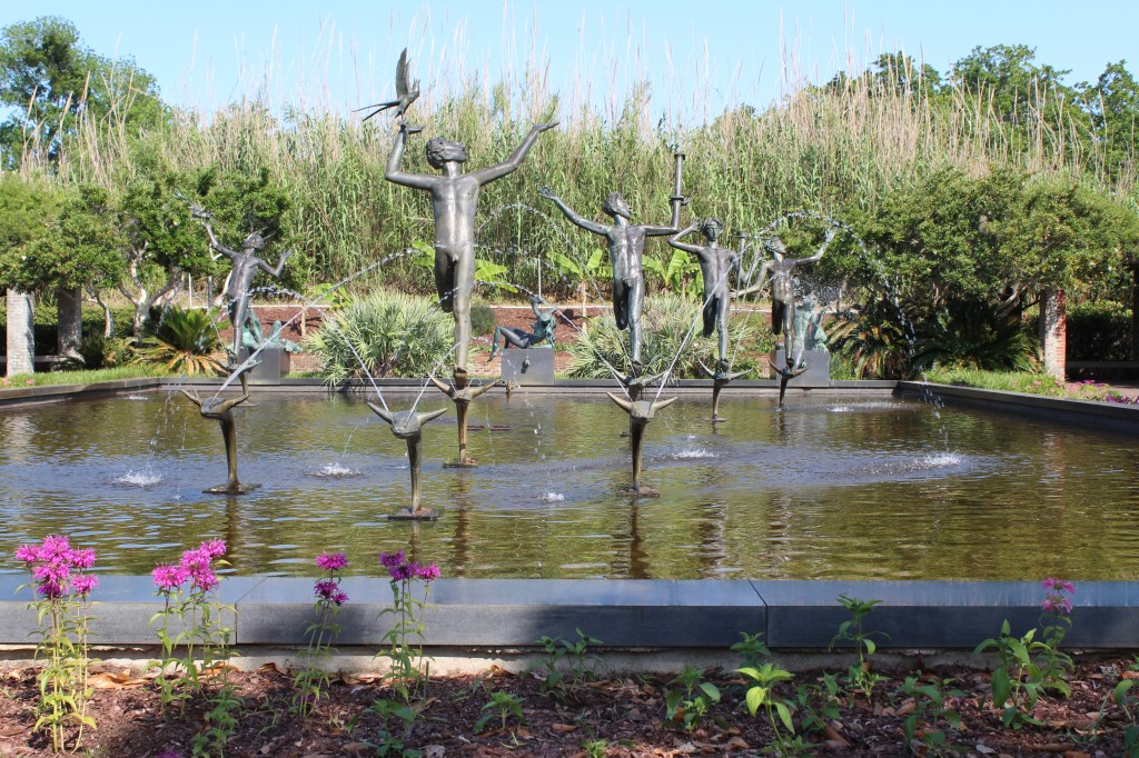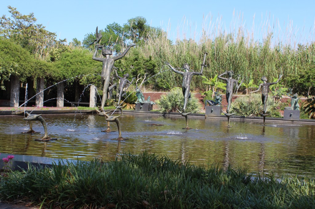 After the zoo, I saw some “heritage breeds” of farm animals at the Floyd Family Heritage Farm, before heading to the Lowcountry Trail, where I learned about rice plantations of the 18th Century. By then it was about 4:00. I still hadn’t acquired a beverage, and the Parkinson’s fatigue was kicking in. I made my way to the nearest drinking fountain to rehydrate and take my afternoon meds. I spent the last hour of the business day slowly meandering through the sculpture gardens. The gardens are pretty and peaceful. They feature a variety of sculptures in a variety of styles and ages, and ranging from small standalone pieces to huge standalone pieces made from multiple huge stones, to large installations consisting of several sculptures. Like this one…