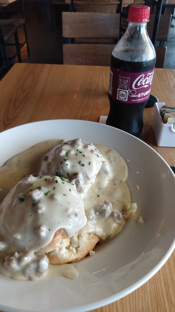 OK, now I really had to find out what this place was all about! I went inside and looked over the menu. It was like Bojangles on steroids. I decided to play it safe and go with the ol’ standard: a full order of Biscuits & Gravy. Here’s what it looked like: