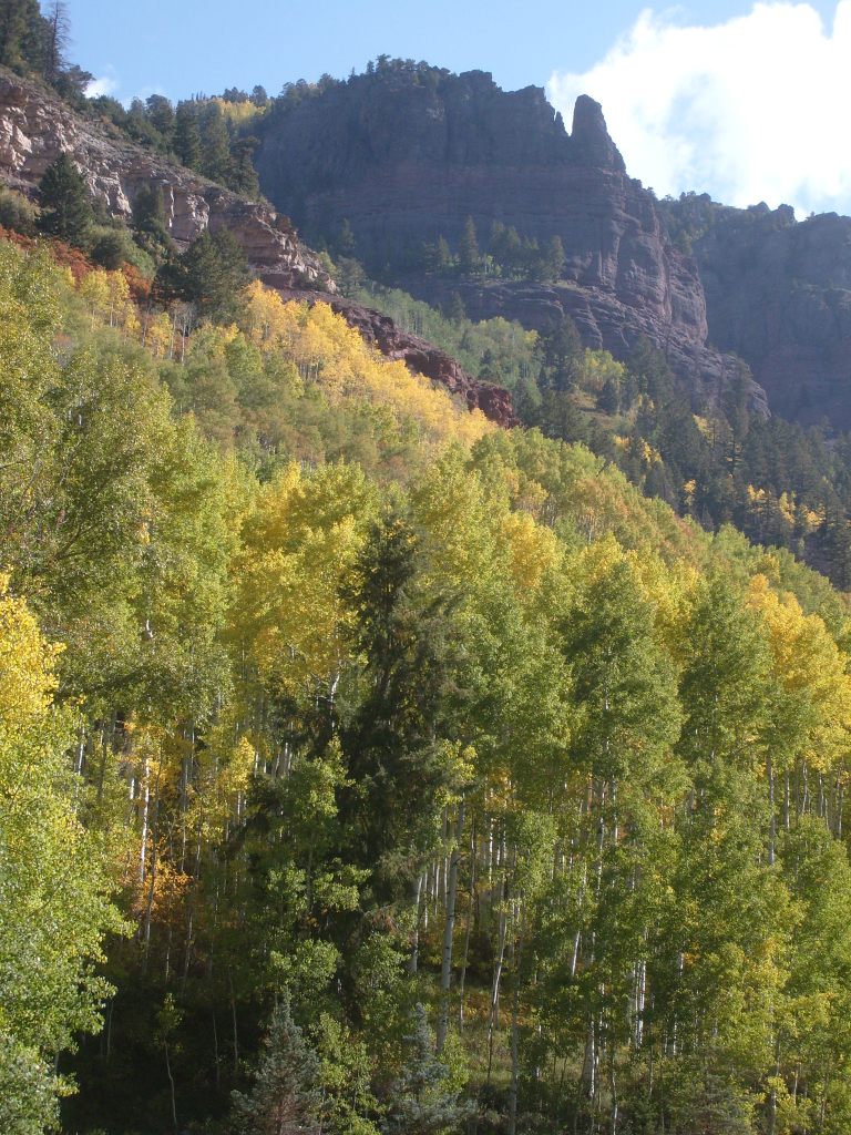 After disembarking from the gondola at the Telluride station, I made my way to the Idarado Trail. This trail was built on a long-abandoned railroad grade; it parallels Telluride’s main street (Colorado Avenue) from the middle of town up through the mining area that was Telluride’s original reason for existence. As you walk through the bottom of the canyon, there is plenty of good scenery above you. Some examples: