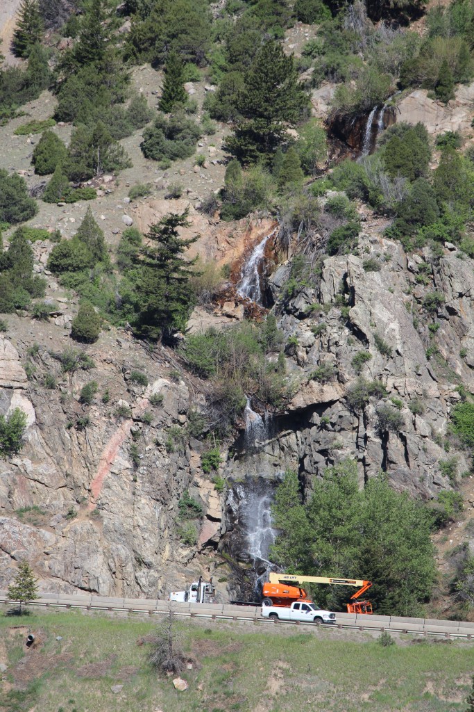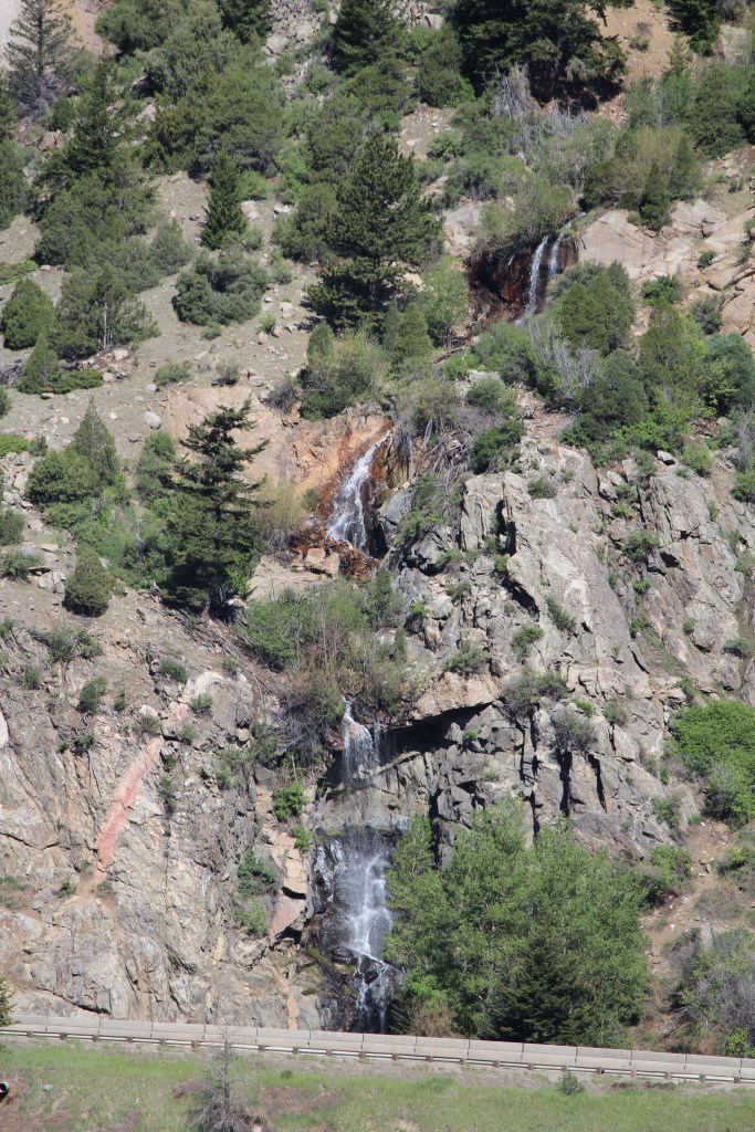 I didn’t take many photos on the outbound (westbound) portion of the trip, as I was in a bit of a hurry; it was a Friday evening and people with booze were waiting for me. In fact, these next two waterfall photos appear to be the only shots I took on the way out. Only the lowest of these falls can be seen from the Interstate itself, and it’s very easy to miss. It’s only visible for a few seconds as you go by at Interstate speeds, and this stretch (between the Georgetown and Silver Plume exits) demands that you pay attention to traffic – it is very steep, and slow-moving trucks often cause traffic to suddenly bunch up in this area.