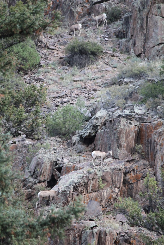 Now it’s Thursday. Today, I am up early to do a lot of walking around multiple historic towns. But first, let’s drive up the Taylor River canyon. What will we see there? Bighorn sheep and fog: