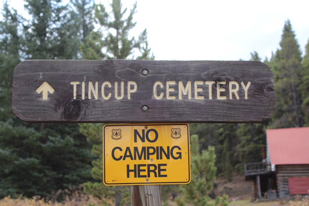 The author of the previously mentioned host town book seems to have had an odd preoccupation with cemeteries. He explored and wrote about the cemeteries at each of the towns covered in the book. Normally, I don’t bother checking out the cemeteries, but his description of the Tincup cemeteries intrigued me. He wrote,