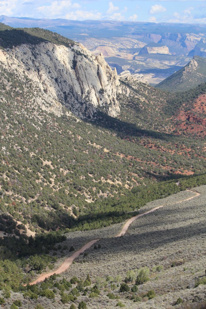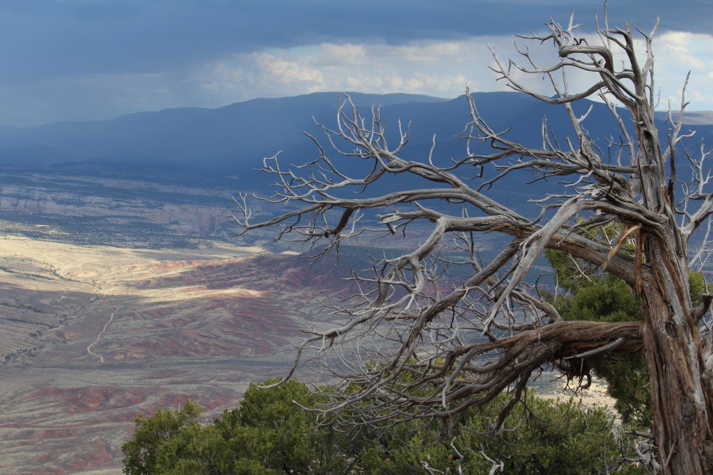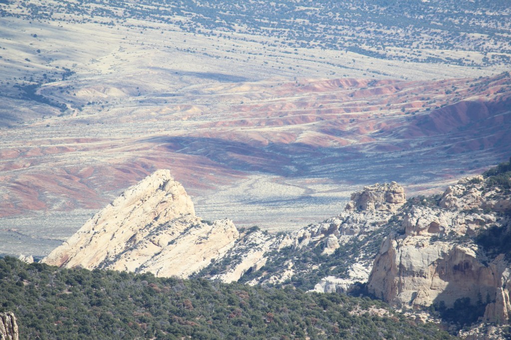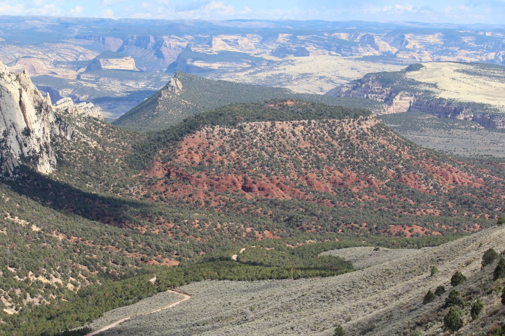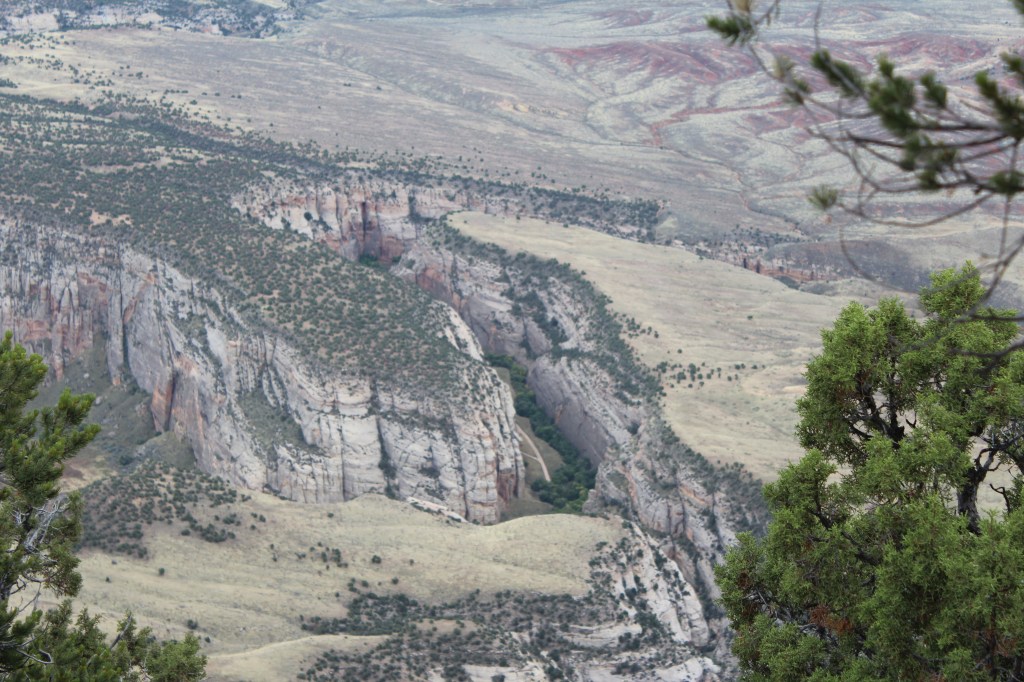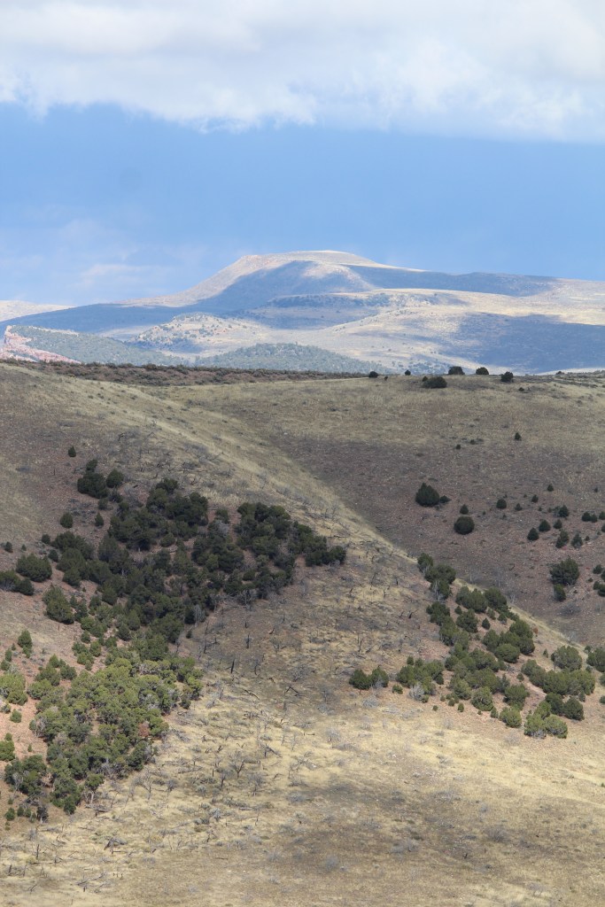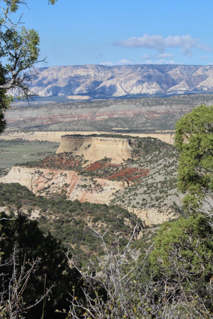 Just a little further up the road, I encountered the trail head for Bull Canyon Rim Trail. This is a shortish, out-and-back trail that, wouldn’t ya just know it, follows the rim of Bull Canyon. It provides some nice views of the rock formations of the canyons in this part of the monument, as well as sweeping views across the high desert plains. And trees…lots of cool gnarly trees…