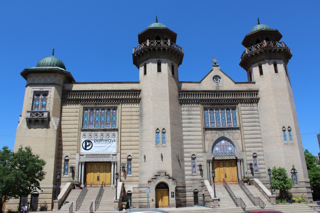 Next, I wandered past a building that was originally known as the Mosque of the El Jebel Shrine. According to Wikipedia, this building never served as an actual mosque. By the time of this visit, it had been sold and had become known as the Sherman Street Event Complex. Here ’tis…
