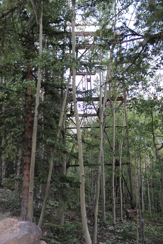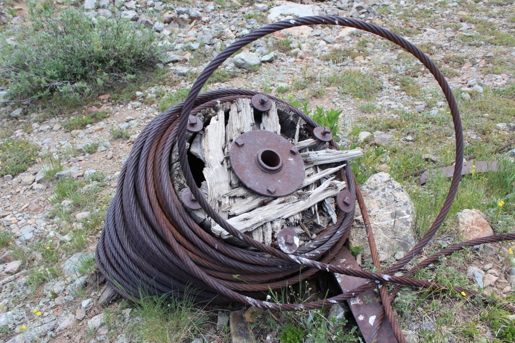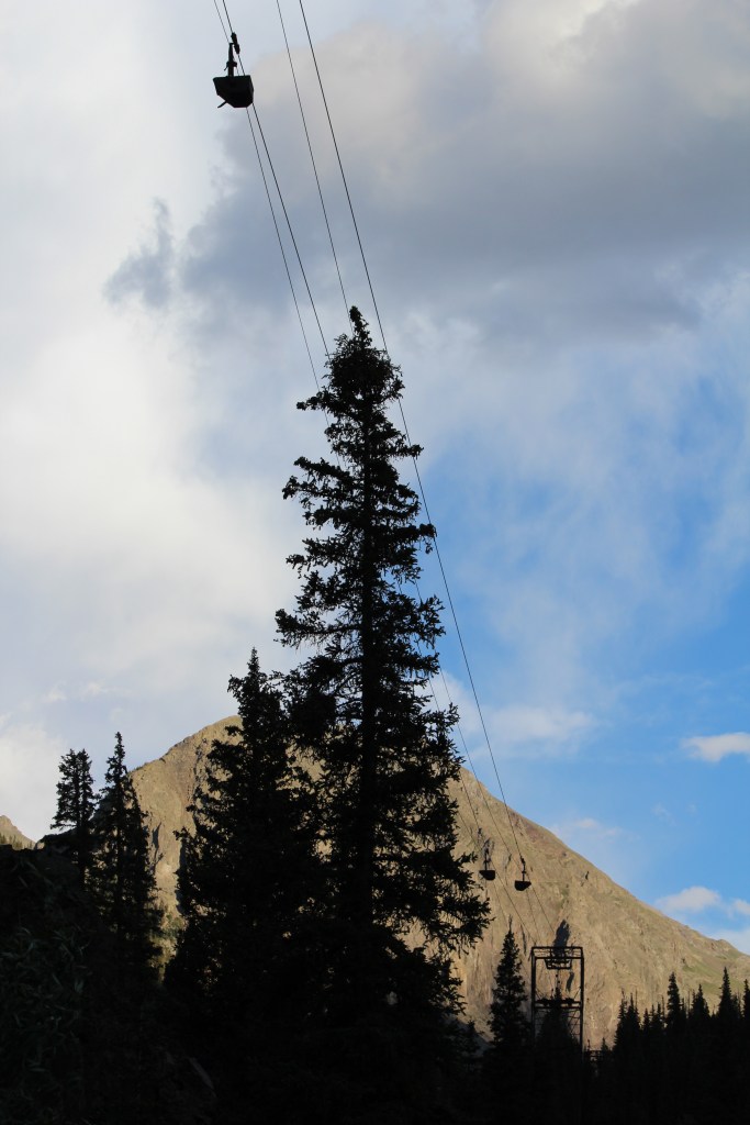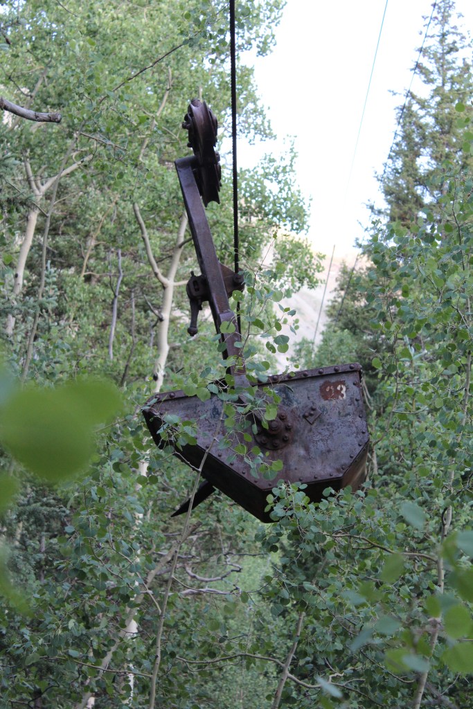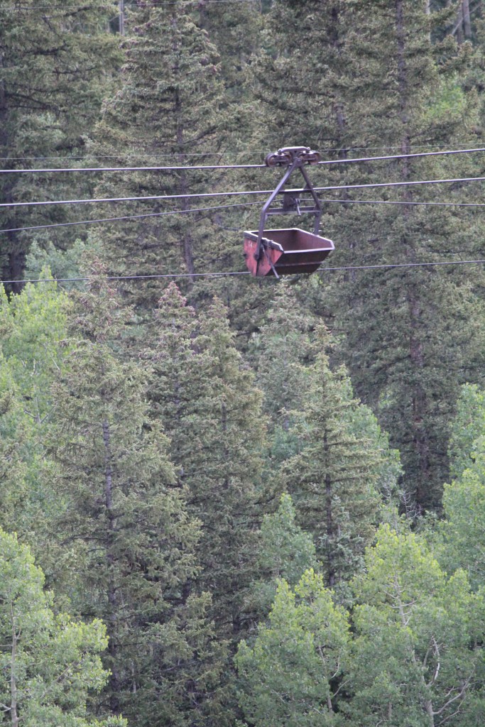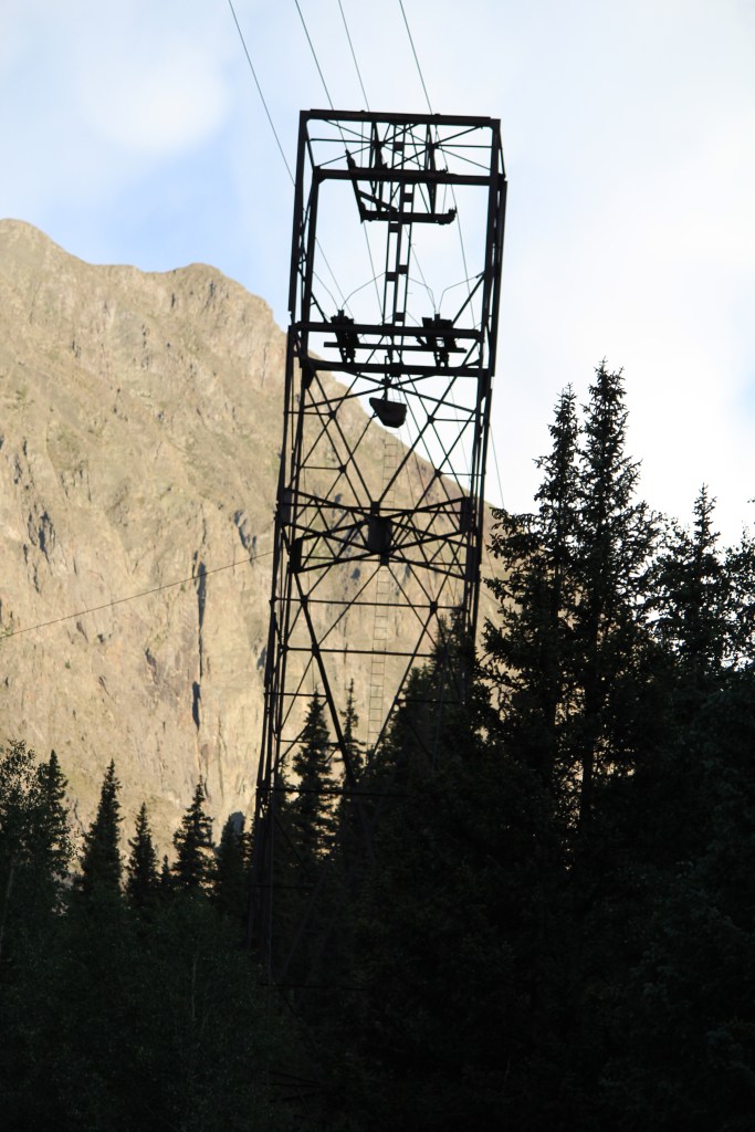 Thanks to Indiana Jones movies, runaway mine train rides at amusement parks, and some of the photos I have posted previously, you are no doubt familiar with ore carts. Generally speaking, ore carts roll on iron rails, like a miniature railroad. But what is a mine owner to do when the mine entrance is located way up on the side (or even the top) of a mountain? How does the ore get to the mill, when the mountainside is too steep and/or treacherous to support one of these miniature railways? The answer is often an aerial tramway. When you hear the words “aerial tramway” you may think of a ski lift, and you’d be right. The aerial tramways employed by mines are basically ski lifts; the main difference being that the seats have been replaced with iron buckets. These buckets carry ore down from the mine and carry supplies up to the mine. And though they were not designed to be seating for humans, they often carried the miners to and from the mine. I have seen old tram towers at Gilman, Nevadaville, and a couple other Colorado mining districts, but Howardsville is the only place I can think of where a long-abandoned aerial tram still hangs in the air, as if suspended in time. And there’s not just one, but two of ’em! Photos of one are below; photos of the other can be found at the end of part three of this series.