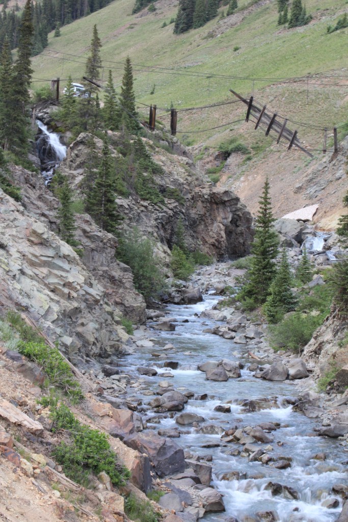 Next, it was time to head back down the canyon to the ghost town of Eureka (pronounced “you reek, uh”). This is more of a town site, rather than a traditional ghost town, as there are virtually no buildings standing in Eureka. As such, it’s hard to know exactly what the town boundaries are, so this next set of pictures are from the overall area between Animas Forks and Eureka and not necessarily within the specific town site of Eureka. Let’s start with a dead pedestrian bridge. No, it’s not a bridge for dead (or even undead) pedestrians. It’s the bridge itself that’s dead. See for yourself…