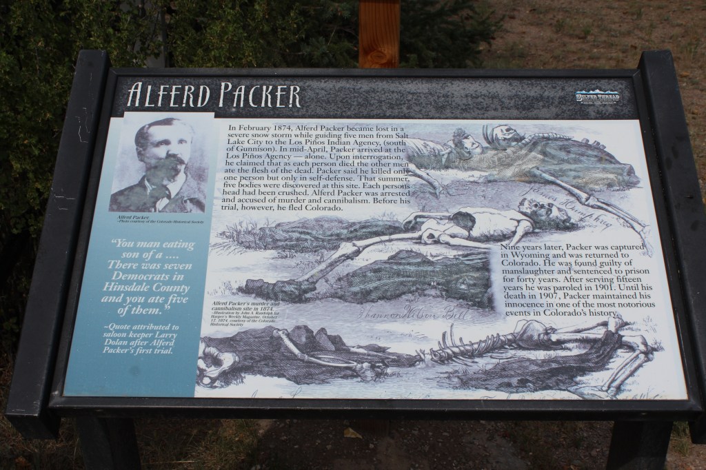 At long last, we have reached the final installment* of my 2013 “Leftover Colorado” trip, which started with this post TWO MONTHS ago! This final day of the trip started with a drive from the town of Gunnison to the town of Creede, and general exploration thereabouts. My first stop along the way was the Alferd Packer historical marker, just south of Lake City, Colorado. If you don’t recognize the name Alferd Packer, read the historical marker: