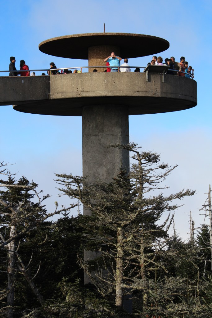 As a Westerner, a name like Clingmans Dome sounds to me like a mountain with a large “bald” area on top – one where you have long-distance views in all directions when you are standing on top of the mountain. But not here. Even a mountain that has the word “Dome” in its name is forested on top. O, what is a poor, simple National Park Service to do? Why, to build an observation tower above the trees, of course! These next photos were taken from the Clingmans Dome observation tower (with the obvious exception of the picture *of* the tower):