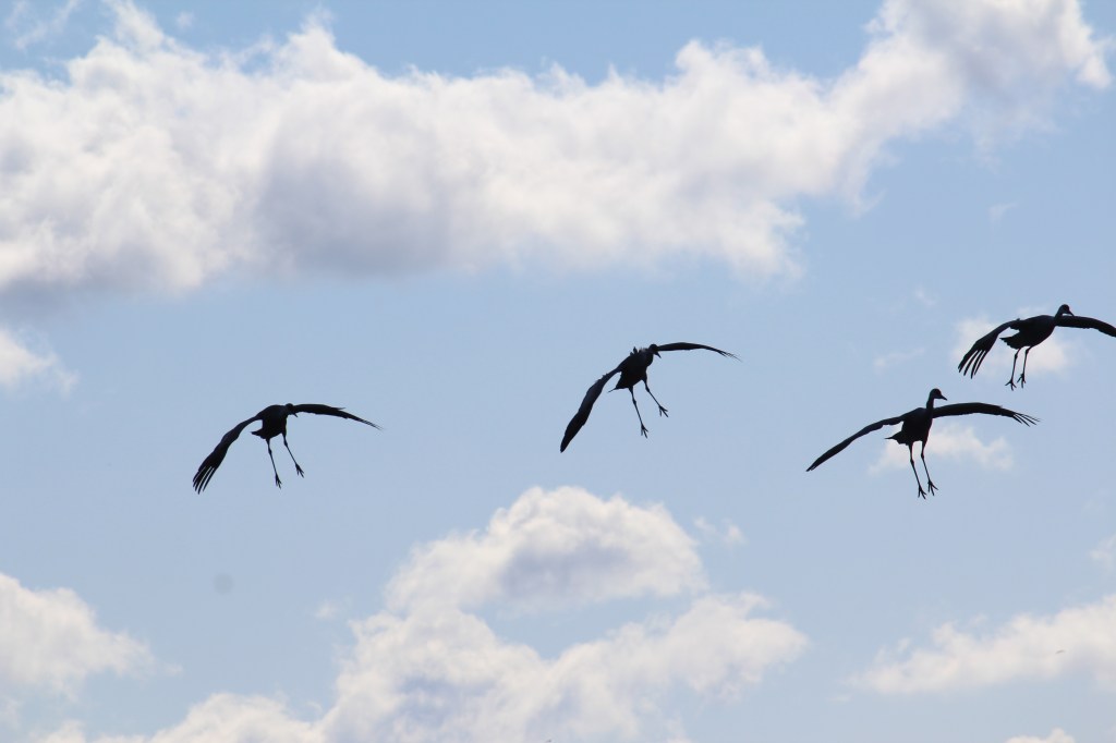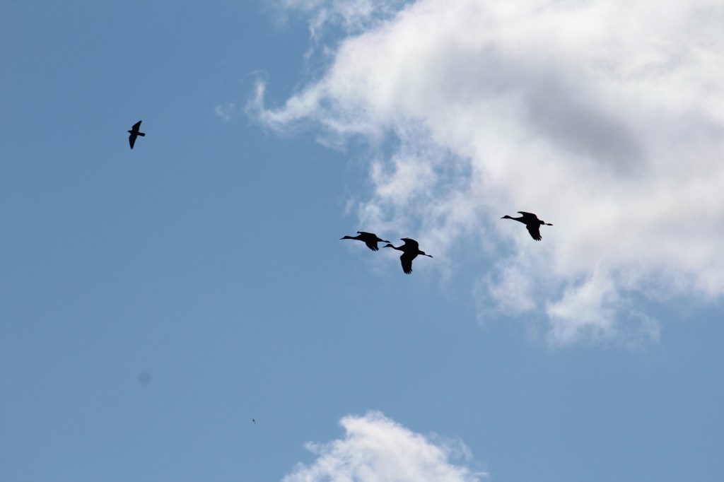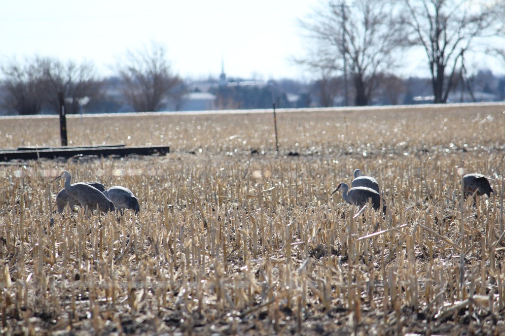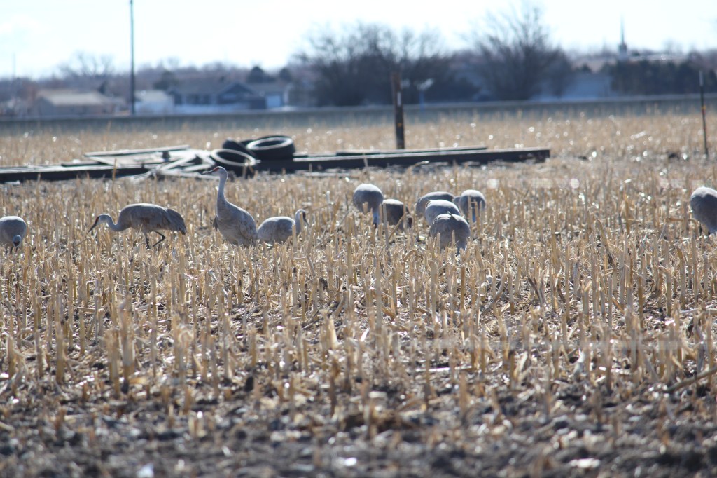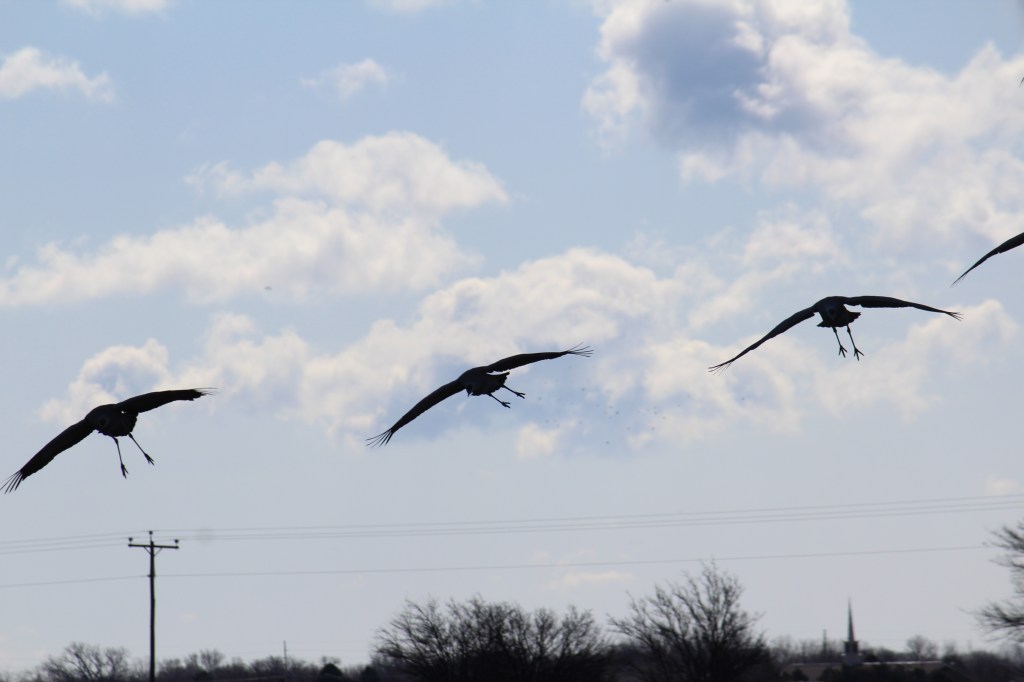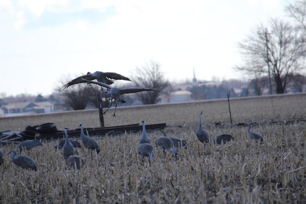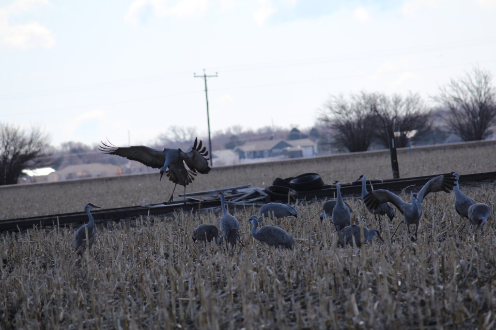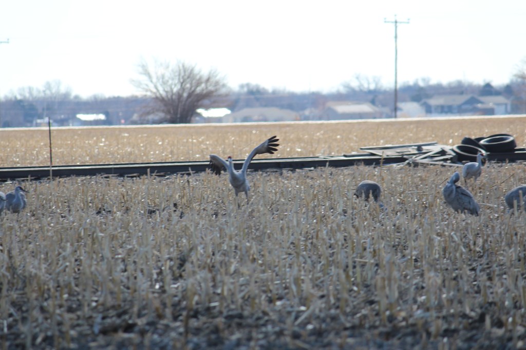 Earlier this week, I spent an entire day wandering slowly to the east of Kearney, looking for cranes but never getting closer than about 100 yards. Today I drove west from Kearney for 90 minutes, to the Golden Spike Tower. When I arrived, with no thought of cranes in my noggin, I was greeted by a group of cranes who were practically invading the parking lot. I was able to hang out within 30 yards of this flock for quite some time. I did some rapid-fire camera clickin’ for the landing sequence below. I guess the “high speed” memory card I bought a decade ago was worth the extra couple bucks. Observe the results: