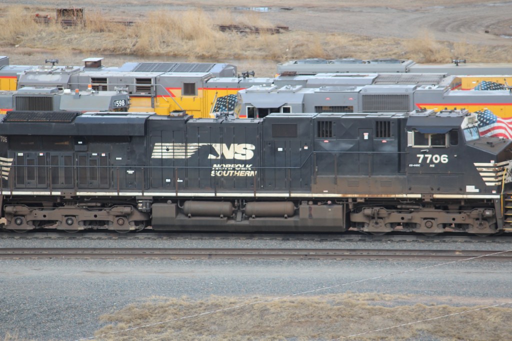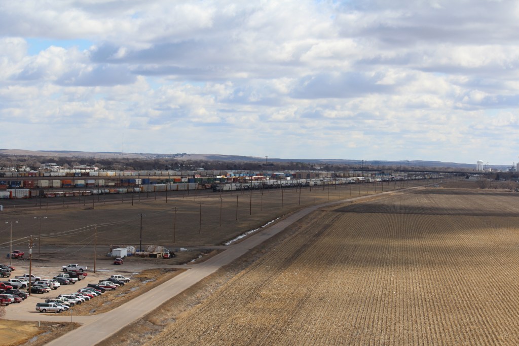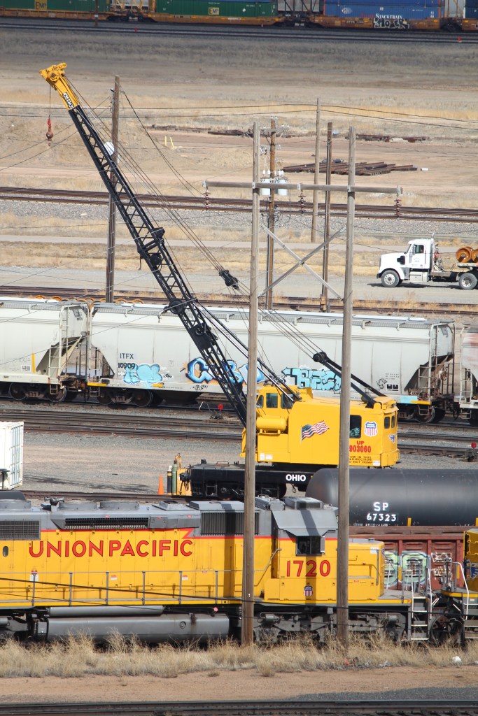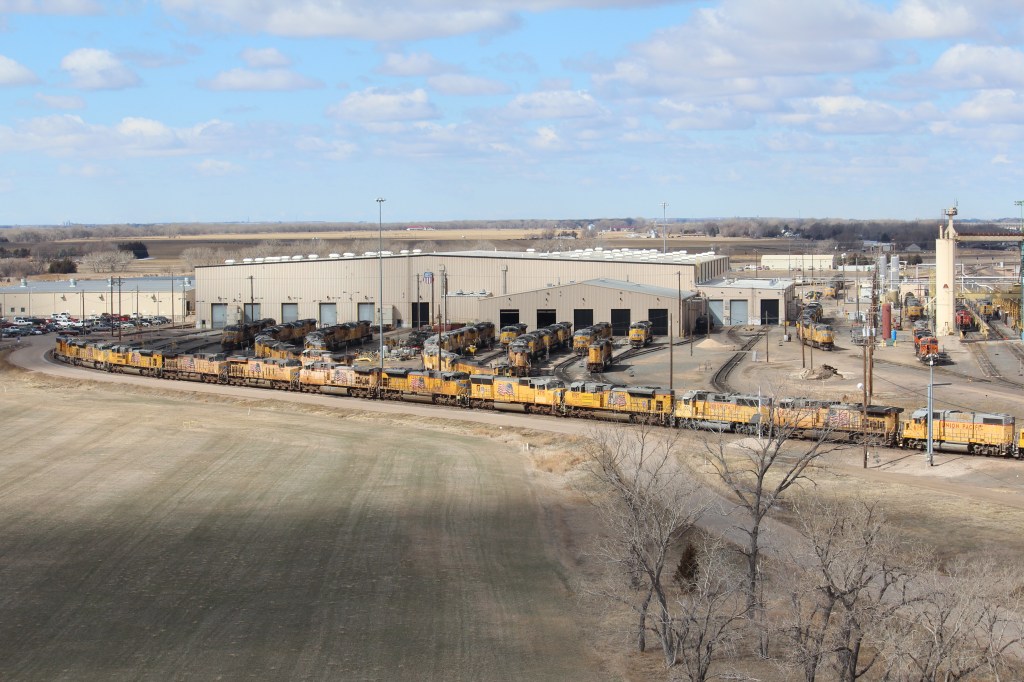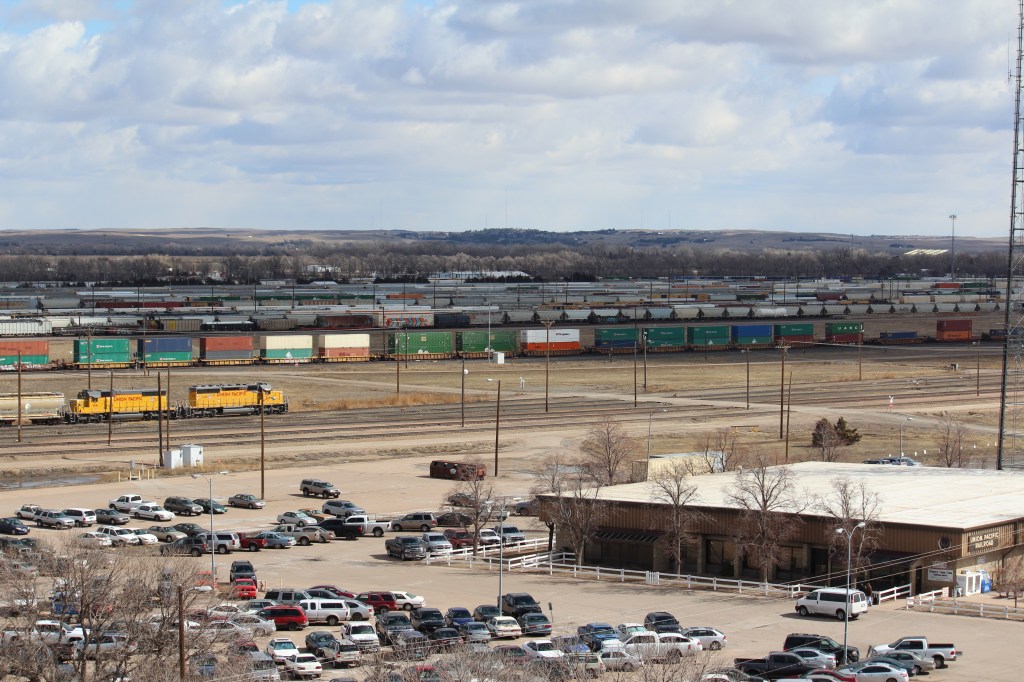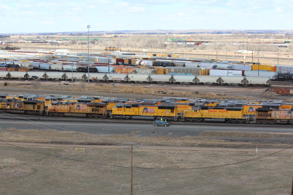 Having spent enough time with the cranes at one end of the parking lot, it was time to turn my attention to the other side of the parking lot: The Golden Spike Tower. This building was constructed for railfans by the Union Pacific. Why here? Because this is the site of the world’s largest (and probably busiest) railyard. It’s called Bailey Yard and approximately TEN THOUSAND railroad cars come through here every day! The yard is eight miles long and covers 2,850 acres. I had figured this would be neat to see, just for the size of it, but that I’d only stay for a few minutes. Instead, I found myself wishing that I’d stayed longer, as I could see myself really getting into the operations of this massively complex facility. I got a few quick pics for your enjoyment: