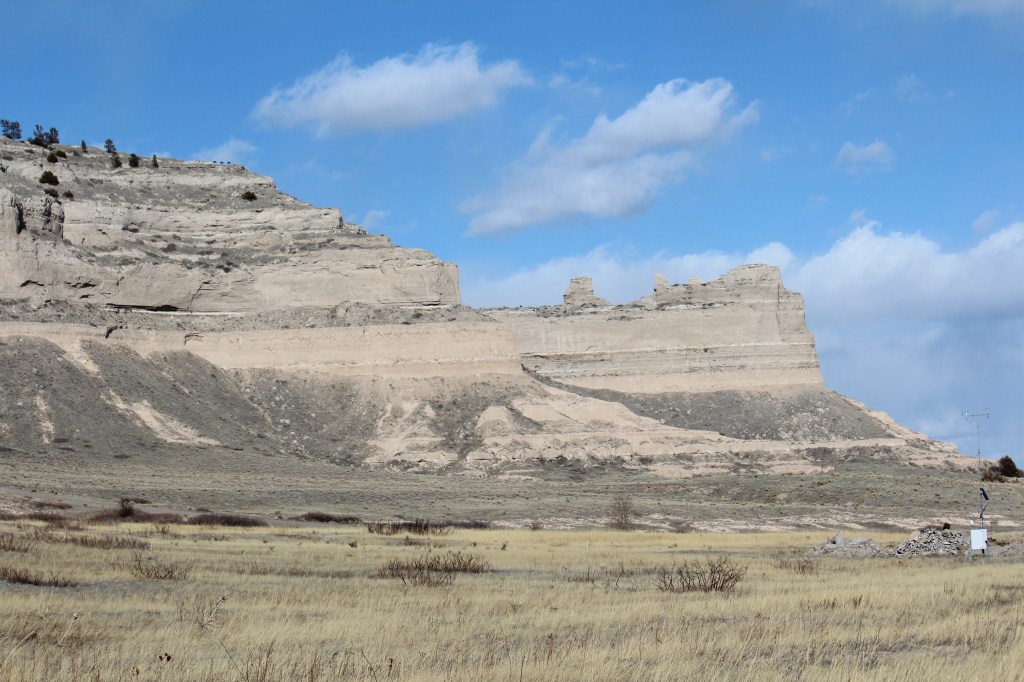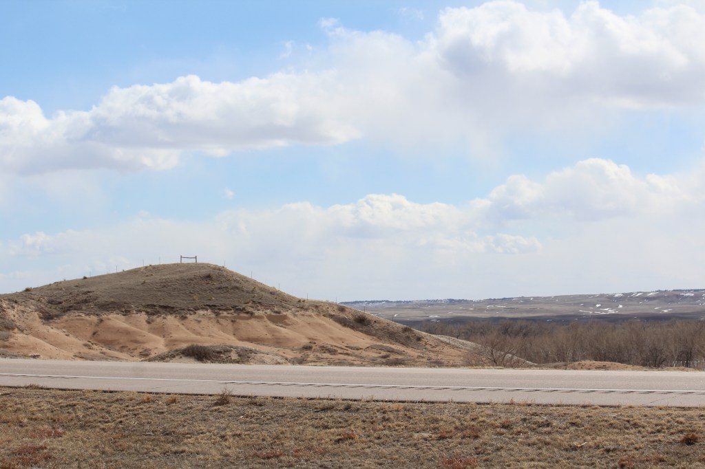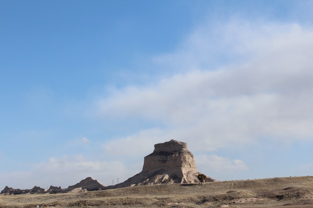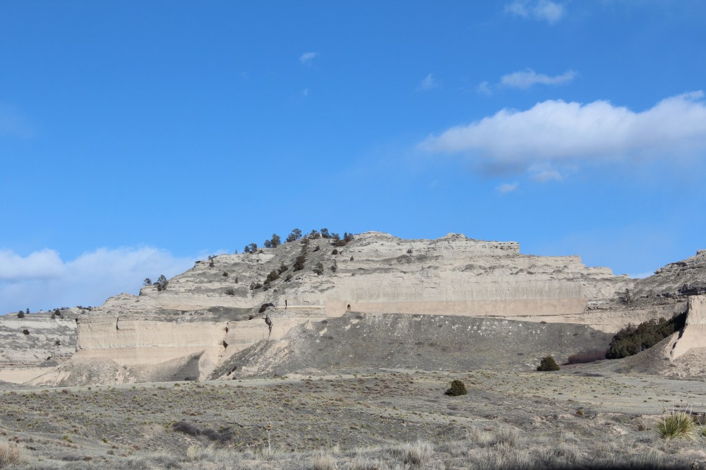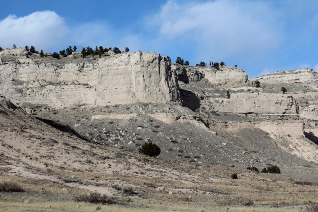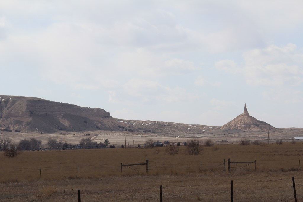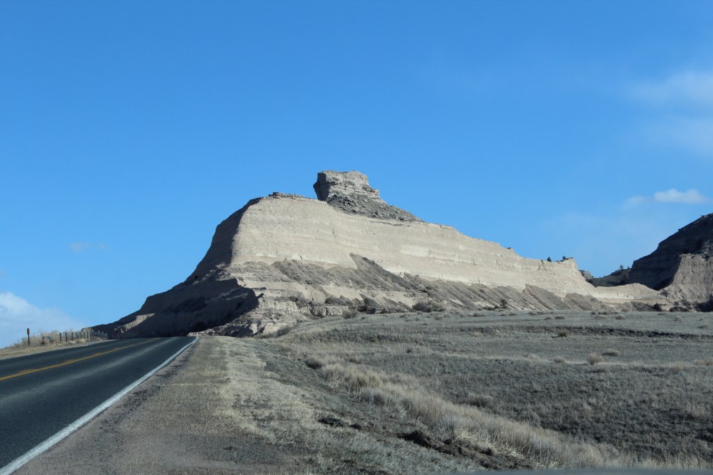 My next destination was Scotts Bluff National Monument, a gigantic rock sticking up out of the plains. The nearby town of Scottsbluff is named for it. Note that the town’s name is one word, and the rock’s name is two words. I’m not sure who decided it should be that way. Probably the same people who were behind the whole Kearny / Kearney deal I mentioned a couple days ago. I arrived too late in the day to go up the Bluff (there’s a road you can drive to the top), but I wasn’t upset – it was cold and super-windy down in town. I did NOT want to see what the wind was like 800 feet up in the air. Instead, I just drove around the south end of the bluff and got a few pics…