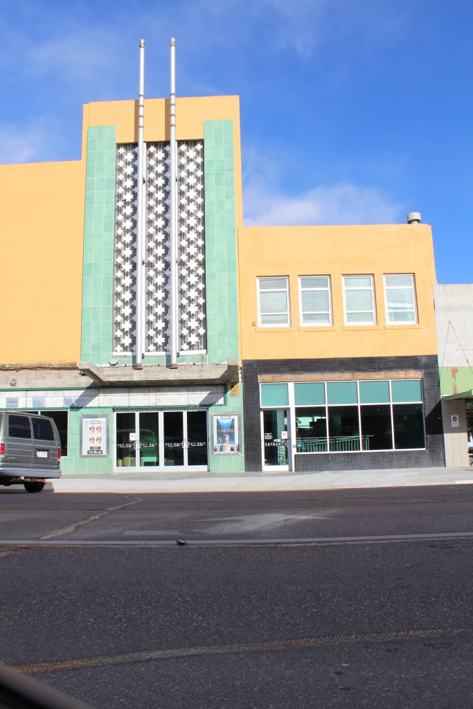 I had heard about a place in the town of Scottsbluff. This place was called the Midwest Theater, and it was supposed to be the best (and maybe only) art deco in town. With the waning sunlight, I headed downtown to find it. Imagine my shock and horror when I discovered that it, like the amphitheater in Harmon Park, is in the midst of being remodeled and/or restored. So, the following is the only photo I took of the Midwest Theater: