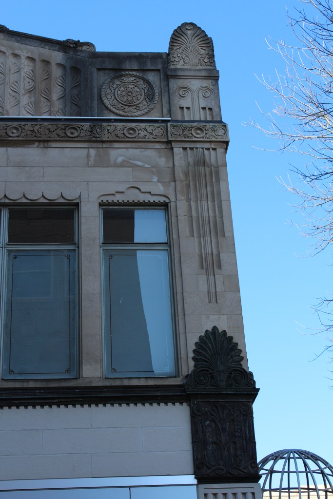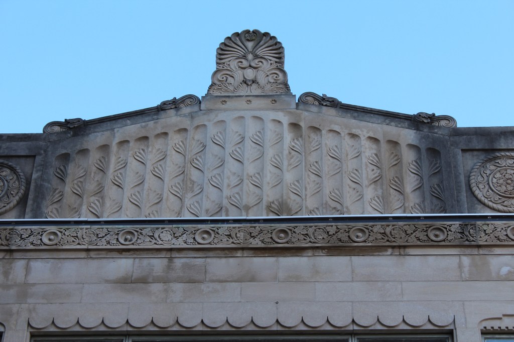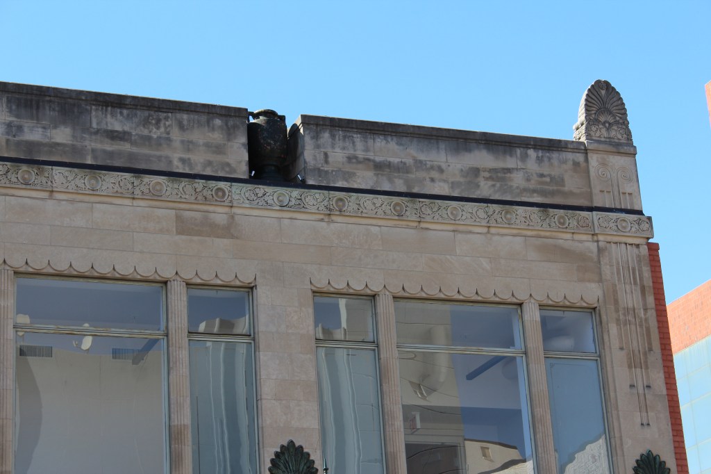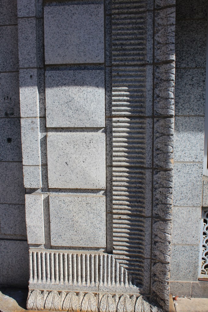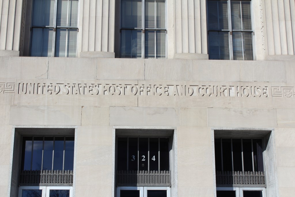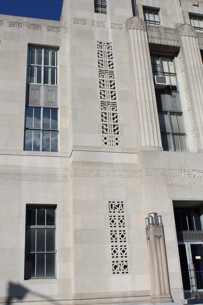 Our last stop in Greensboro is the L. Richardson Preyer Federal Building / Courthouse. Here I had an interesting encounter with an FPS officer. FPS is the Federal Protective Service. They are responsible for security at Federal courthouses and other buildings housing U.S. government agencies. As I was standing on the grass outside this Federal Courthouse, an FPS officer emerged from the building and began interrogating me. I explained that I was just an art deco fan and wannabe photographer. He asked why I was shaking. A fair question under the circumstances, and I gave him the up-front answer that I have Parkinson’s. He looked me over for a moment before accepting my story, then laid down the law. He said that taking photographs on the courthouse property is forbidden, but that taking photographs of the courthouse property is allowed. Come again? He explained further: the building and the grass surrounding it are Federal property, and photography is not permitted by the Feds. BUT, the sidewalk (a mere five feet from where I had been standing on the grass) was city property, and therefore out of the jurisdiction of FPS. And the city government apparently doesn’t care about people photographing the Federal government’s building. So, here are the pictures I got from the sidewalk: