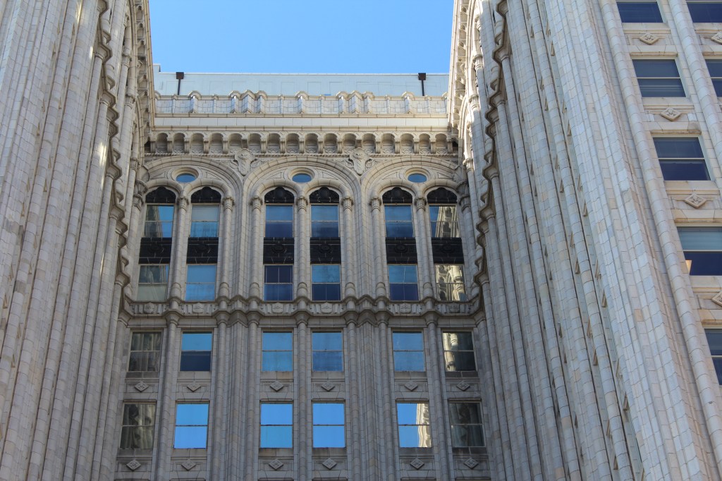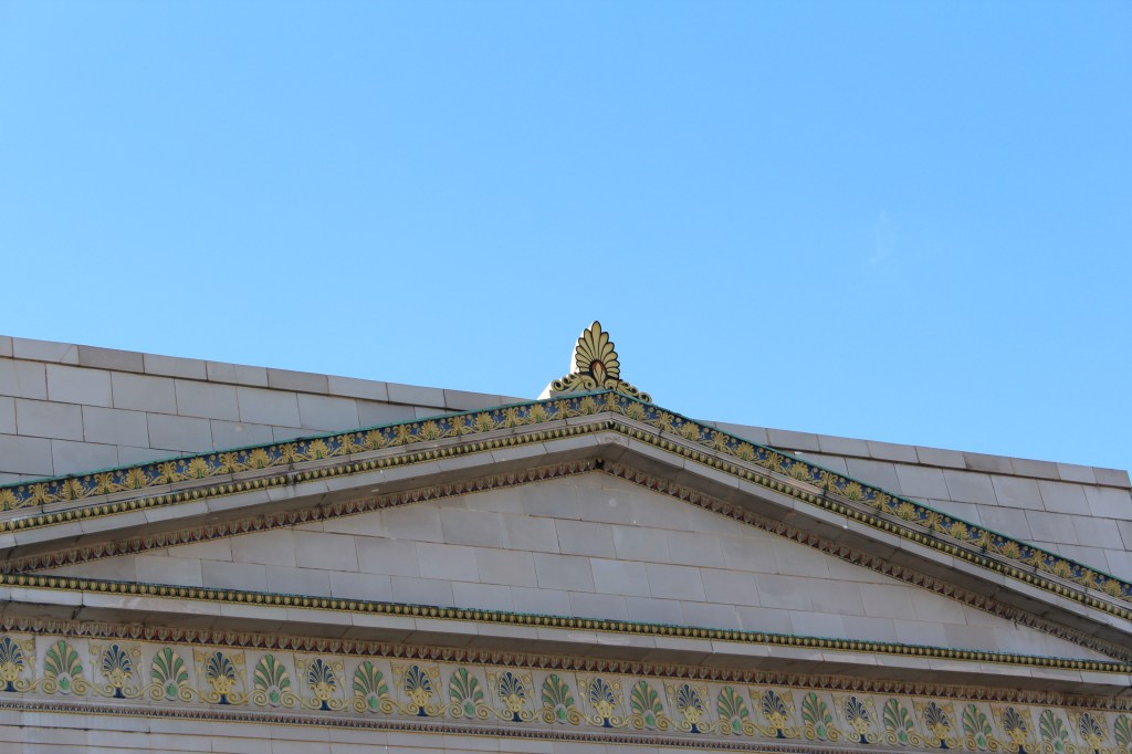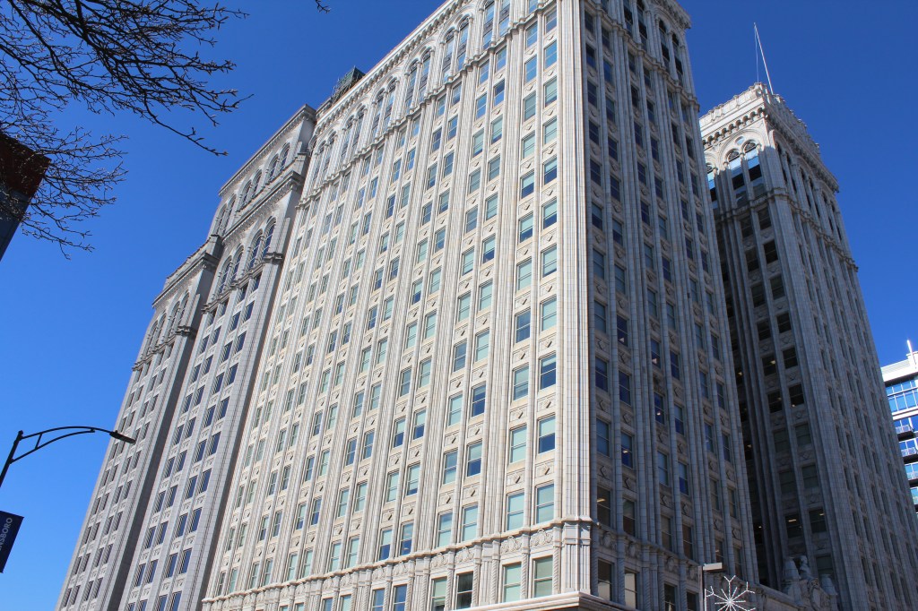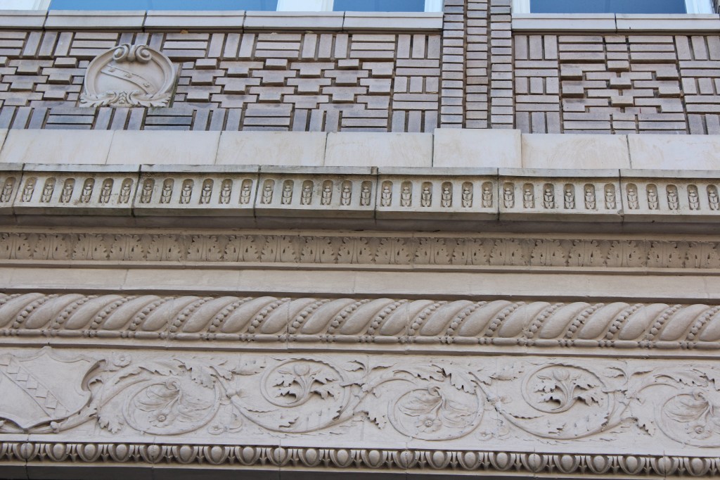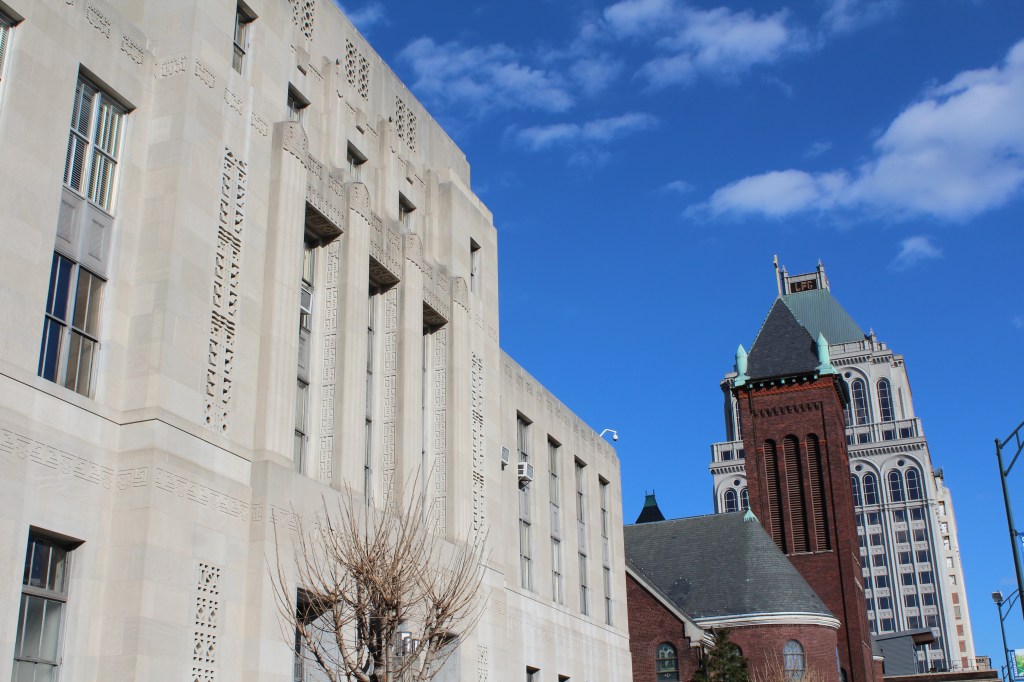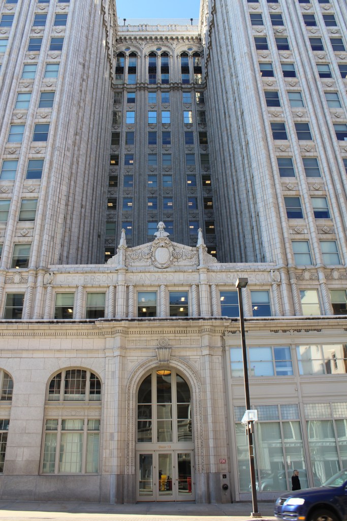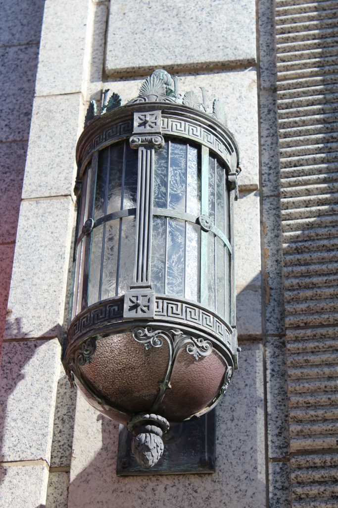 Our last stop in Greensboro is the L. Richardson Preyer Federal Building / Courthouse. Here I had an interesting encounter with an FPS officer. FPS is the Federal Protective Service. They are responsible for security at Federal courthouses and other buildings housing U.S. government agencies. As I was standing on the grass outside this Federal Courthouse, an FPS officer emerged from the building and began interrogating me. I explained that I was just an art deco fan and wannabe photographer. He asked why I was shaking. A fair question under the circumstances, and I gave him the up-front answer that I have Parkinson’s. He looked me over for a moment before accepting my story, then laid down the law. He said that taking photographs on the courthouse property is forbidden, but that taking photographs of the courthouse property is allowed. Come again? He explained further: the building and the grass surrounding it are Federal property, and photography is not permitted by the Feds. BUT, the sidewalk (a mere five feet from where I had been standing on the grass) was city property, and therefore out of the jurisdiction of FPS. And the city government apparently doesn’t care about people photographing the Federal government’s building. So, here are the pictures I got from the sidewalk: