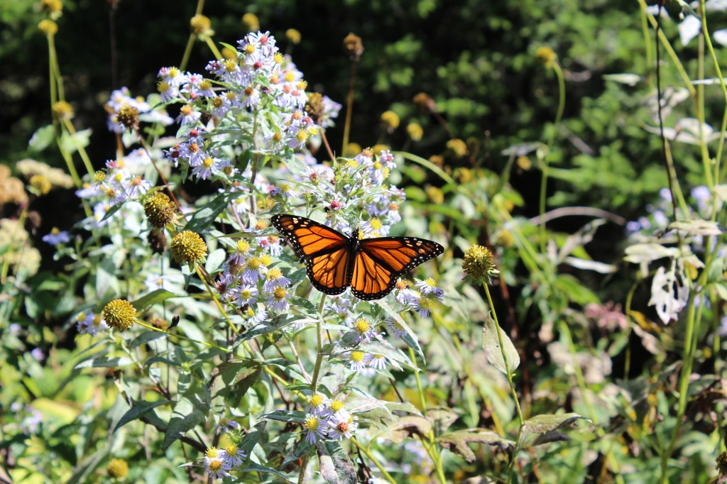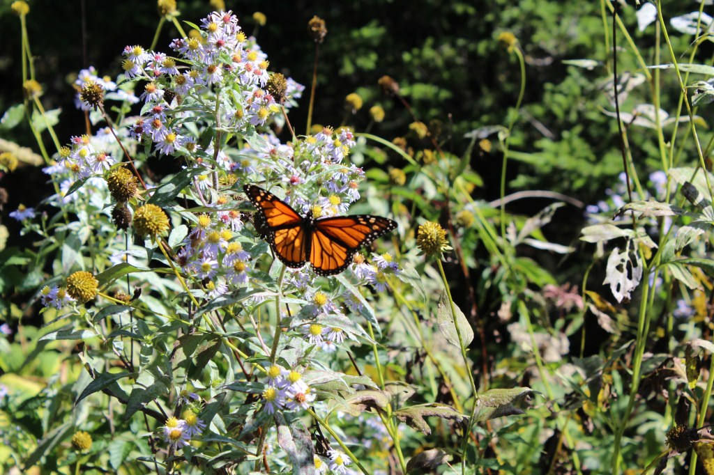 I had hoped that there would be a lot of good scenery along such a trail. I was wrong. As you will see, there is some nice scenery at the beginning of the route (from where I parked at the trail’s upper end), but the vegetation along the trail is tall and dense enough to block any long-distance views. But I did get some decent pics of a monarch butterfly. Check all dis out:
