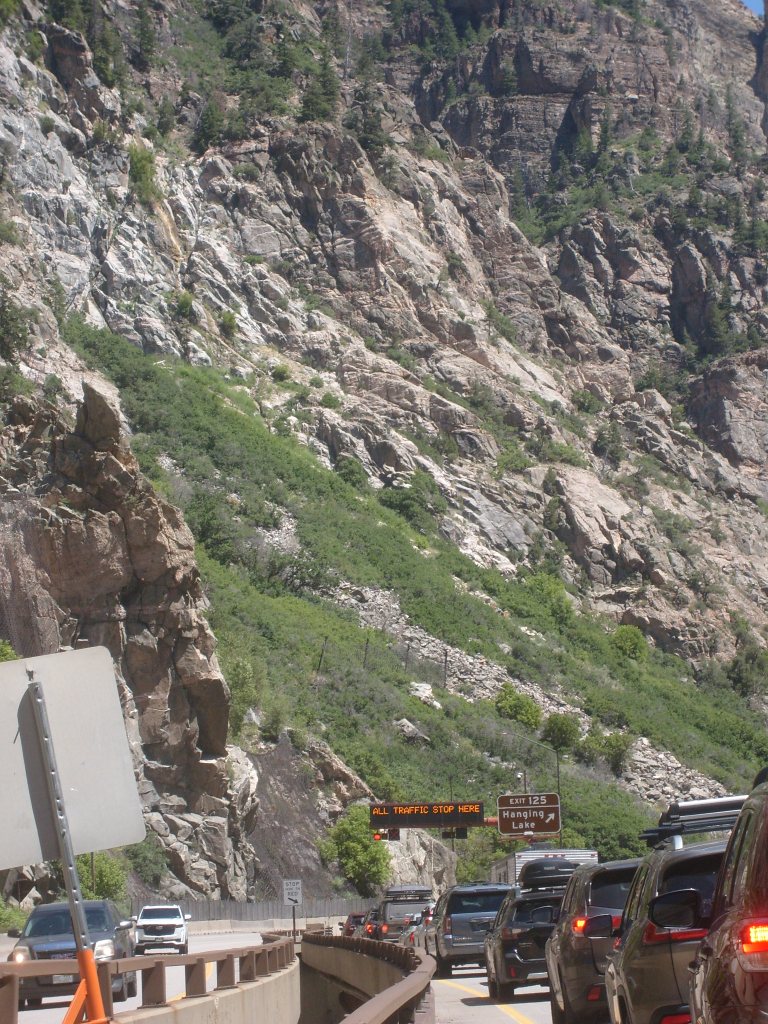 Having done today’s activity yesterday, I had the whole day to slowly meander my way to my next overnight stay, in the town of Kremmling. Again, I would be seeing new stretches of road, and again, they turned out to be pretty tame by Colorado standards; thus, I took only a few pictures. First up, traffic was halted for several minutes at the eastbound entrance to the Hanging Lake Tunnel in Glenwood Canyon. This provided an opportunity to get some pics that I wouldn’t normally be able to get: