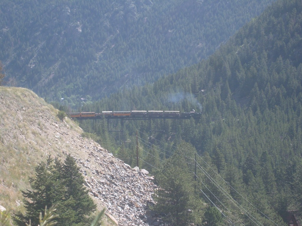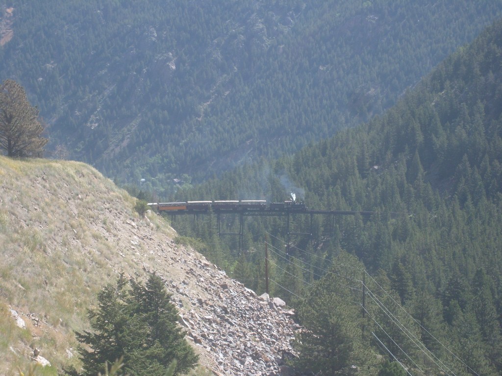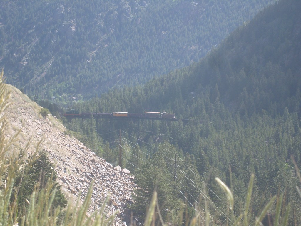 On this day, I was ultimately headed to a friend’s housewarming party in Lafayette, Colorado. But that didn’t start until late afternoon, so I decided to go to Central City (one of the few Colorado towns with legalized gambling) and throw away part of my life savings. So, I did. On the way to Central City from Kremmling, I stopped at the rest area overlooking the Georgetown Loop Railroad. My timing was absolutely perfect, as trains were departing from both stations just as I was getting out of the car: