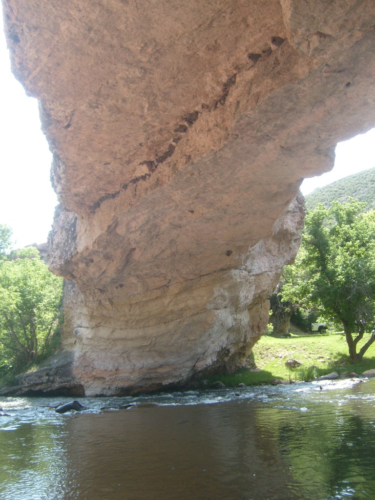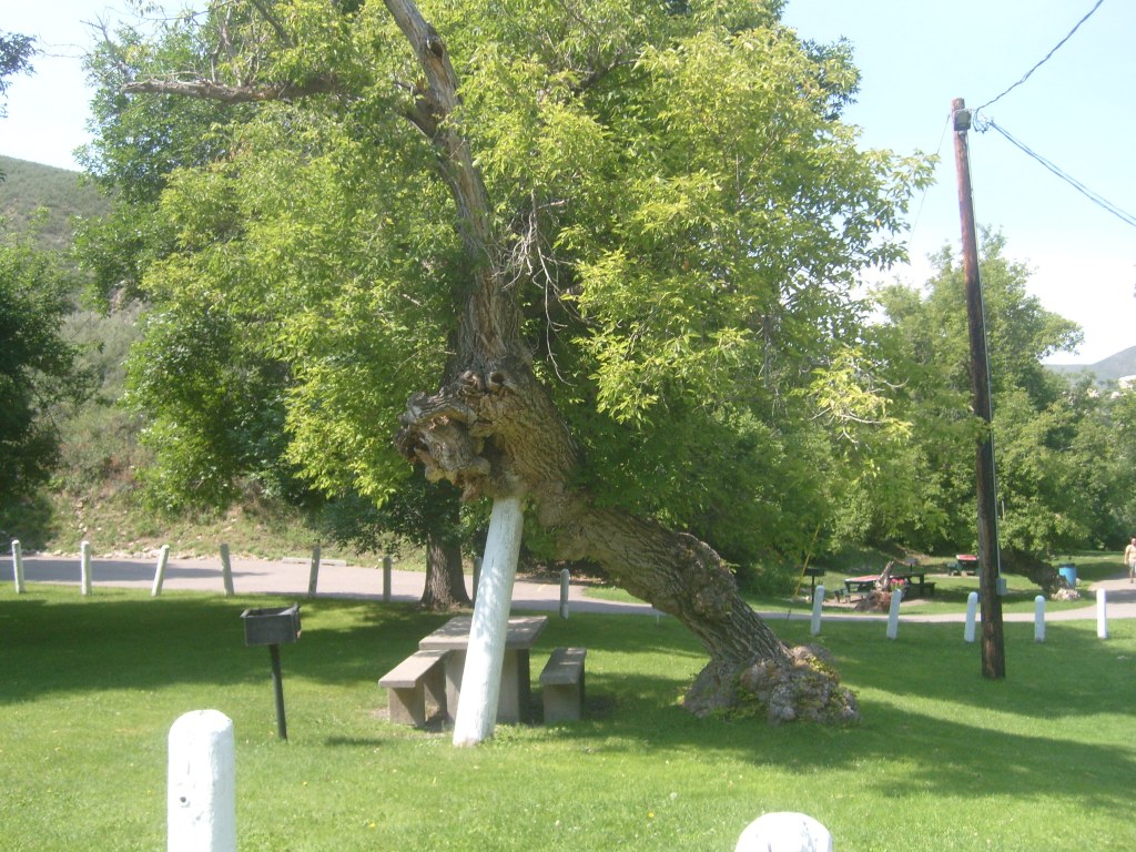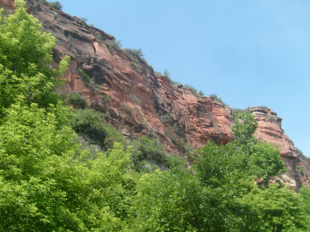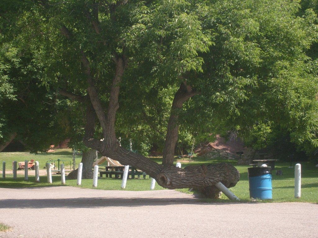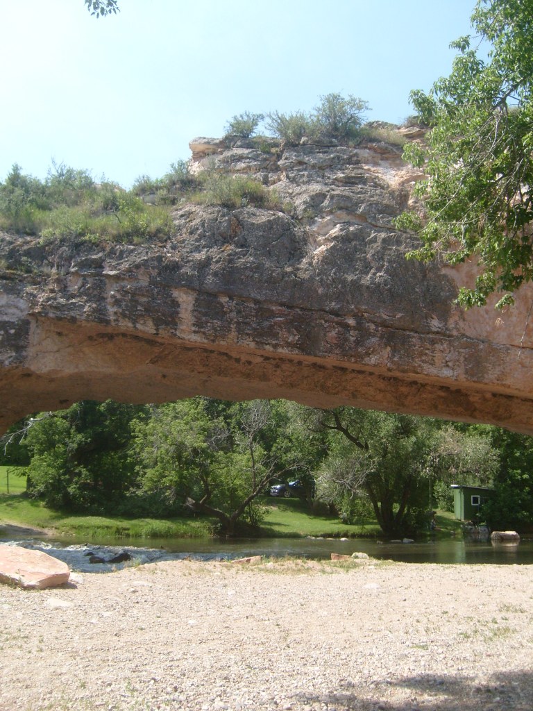 After seeing the pronghorns, I made a Y-turn, headed back to the “main” road, and found the natural bridge quite easily. The park where it’s located has more than just the natural bridge itself to be seen. The parking lot, for instance, is partially surrounded by a big, red cliff. Plus, trees on crutches: