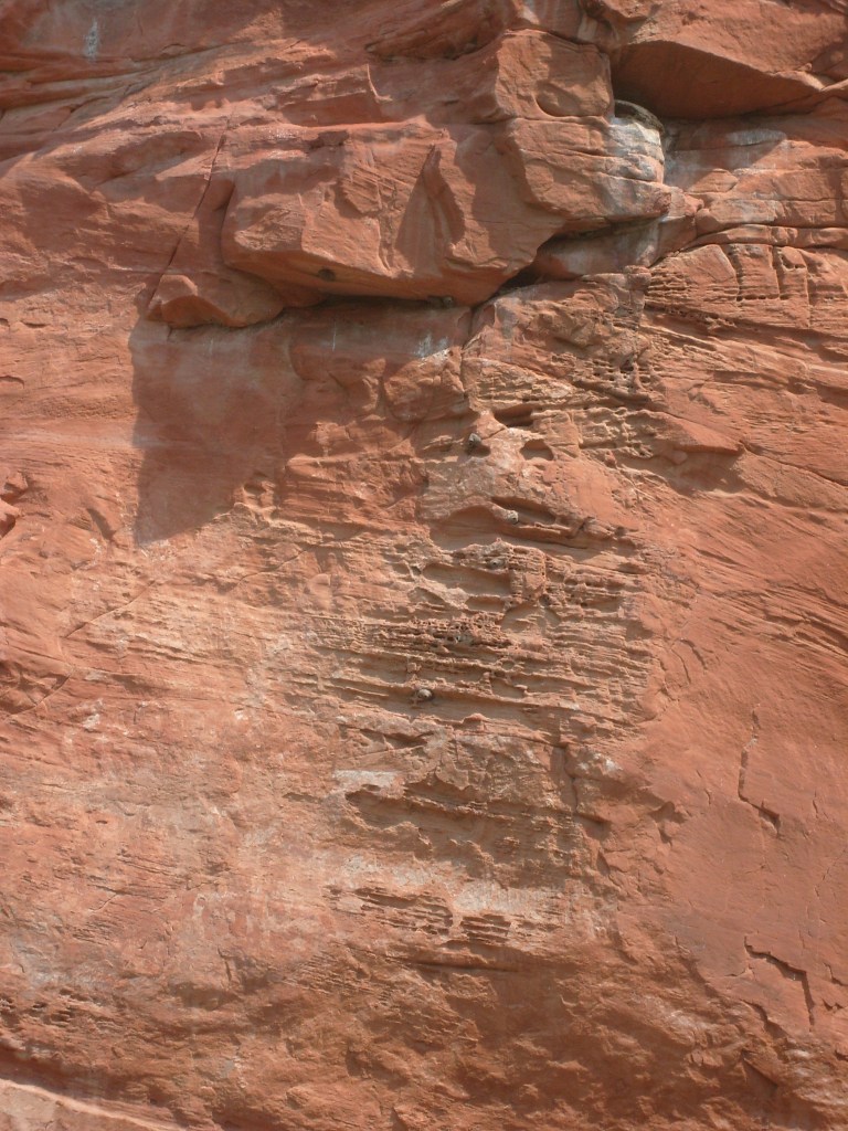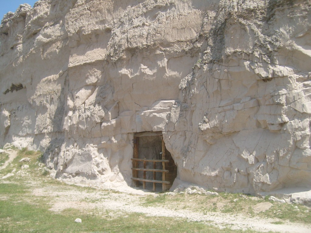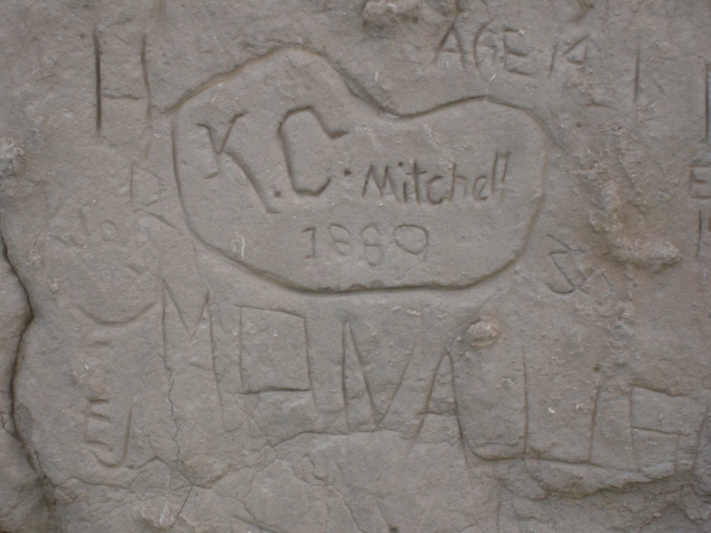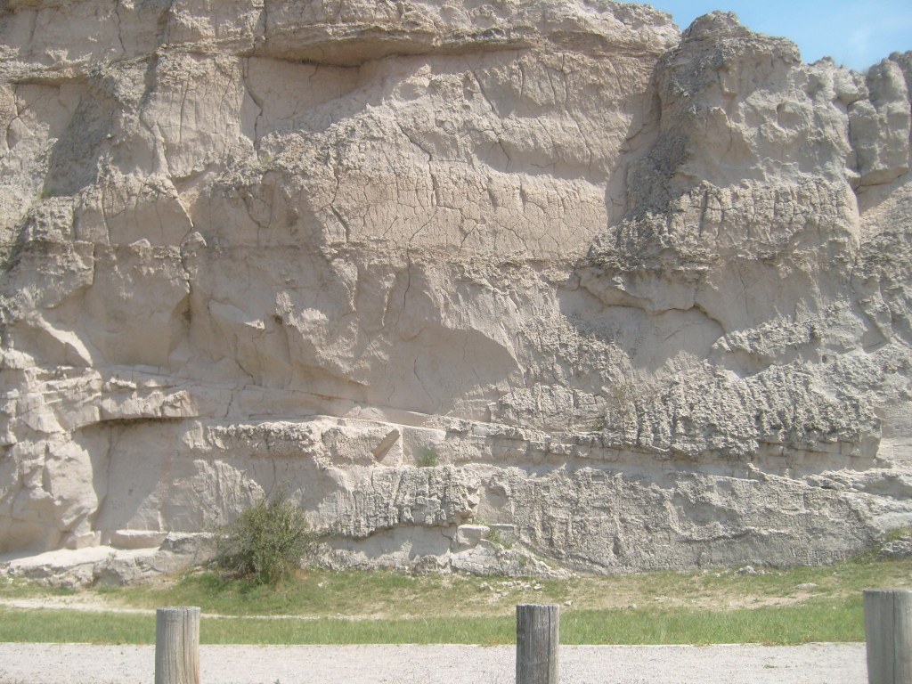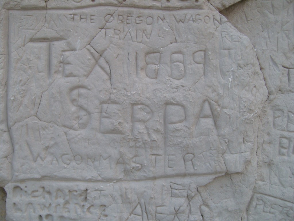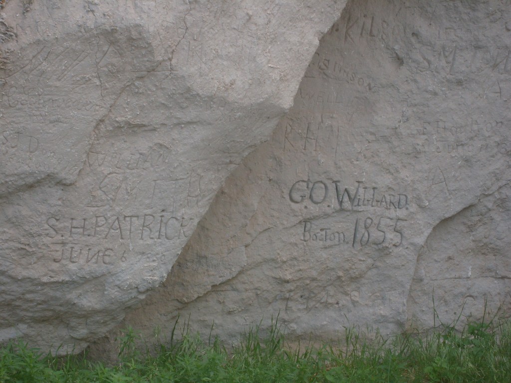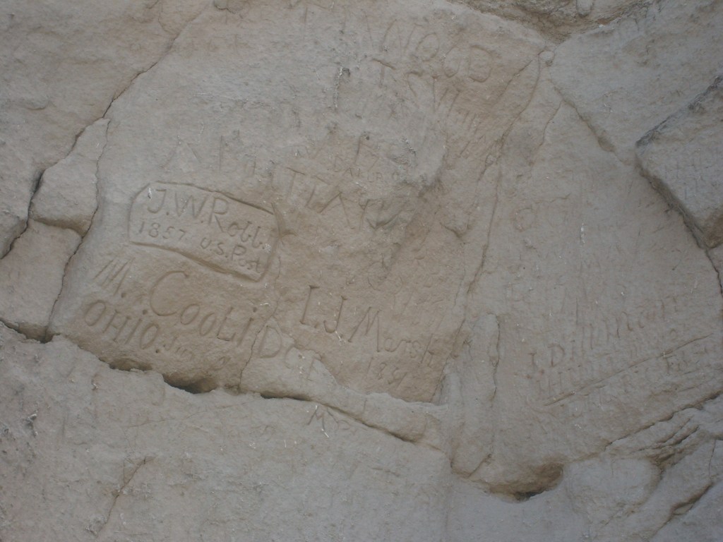 Register Cliff is one of several places along the Oregon Trail where the travelers carved their names into the rock formations they encountered along the way. Since then, it seems to have become almost a local custom for just about everybody to add themselves to the “register”. There are a few names still visible from the Oregon Trail years (1830’s through 1860’s), but many more from the 20th century, and a few from the 21st. During the 1920’s, this land was part of a ranch; the ranch owners made a BIG mark on Register Cliff by blasting out part of it to make a fruit cellar. If you decide to visit this place yourself, on a hot day, be prepared – there is absolutely no shade available here! That said, here are the pics: