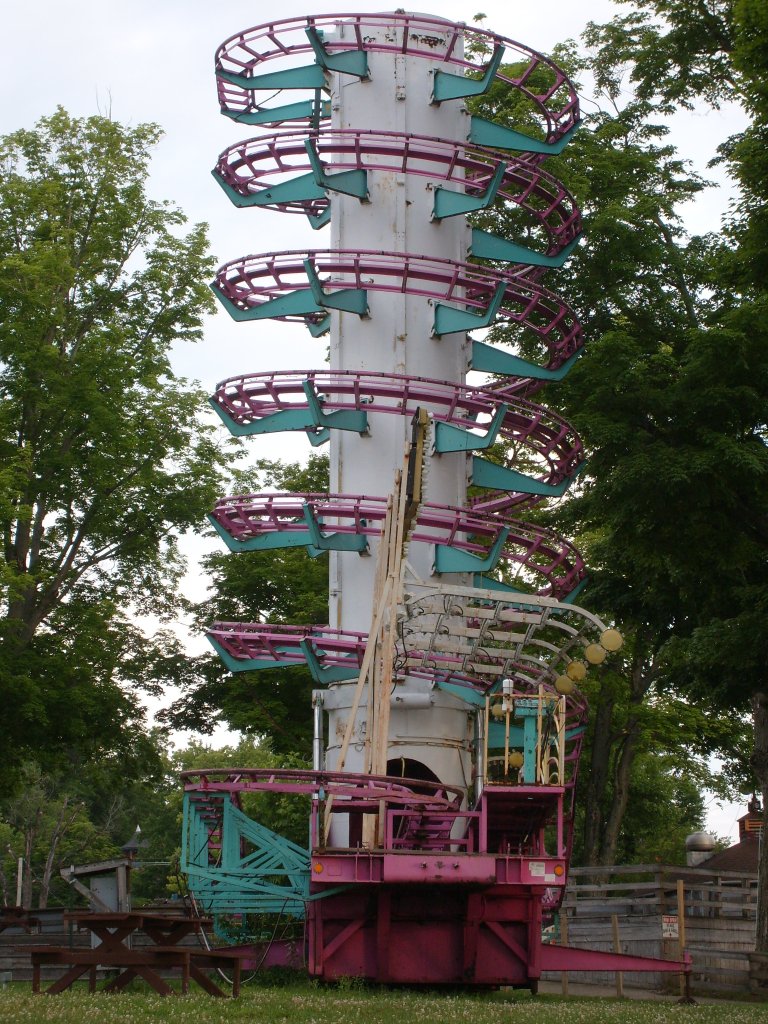 Conneaut Lake Park was my main reason for choosing Pennsylvania for my 2014 summer vacation. Y’see Conneaut was home to the Blue Streak*, a wooden roller coaster that was built in 1938, and that was under threat of demolition in 2014. I’m glad that I went when I did, because the Blue Streak was a really fun old coaster, but it was indeed demolished a few years later. And not without reason. If you’ve ever ridden an old wooden coaster, you no doubt remember being pulled up the first hill by a lift chain. The section of track you are on while being pulled up is completely straight. Except on Blue Streak, where a significant “dip” had developed in the left rail – never a good sign. And that wasn’t the only symptom of deterioration. Like many coasters of its era, the Blue Streak passed through a winding wooden “tunnel” on its way from the station to the lift hill. On multiple occasions, the train just stopped in the tunnel. There weren’t any brakes in the tunnel; the thing just slowed to a halt on its own accord. When this happened, the ride operator had to get out and push. No, seriously! Each time it stopped in the tunnel, the ride op left the control panel, walked down into the tunnel, and physically pushed on the last car until it got to rollin’ again.