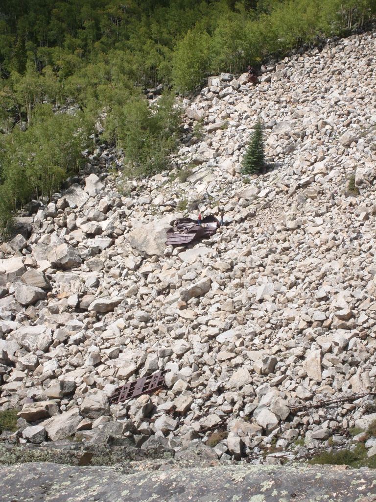 Having recently read an old book on the Colorado Midland Railroad, I was intrigued by one particular incident mentioned therein. There is a short stretch of track (now 4-wheel drive road) called Hell Gap. On one side of the road, there is nothing but rock, towering above you. On the other side, there’s nothing but air – a significant drop onto a steep scree slope. I don’t remember the circumstances or the specific year, but at some point during the late 19th century, a coal car (a.k.a. locomotive tender) derailed right at Hell Gap, and went tumbling down the mountainside. Luckily, it was the only thing that derailed, so no one was hurt. However, the battered but still intact coal car was plainly visible to railroad passengers. Upper management at the railroad company feared seeing this would unnerve their passengers, so they hired a couple of students from a local college, gave ’em a few sticks of dynamite, and told them to blow up the coal car.
