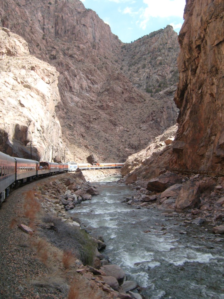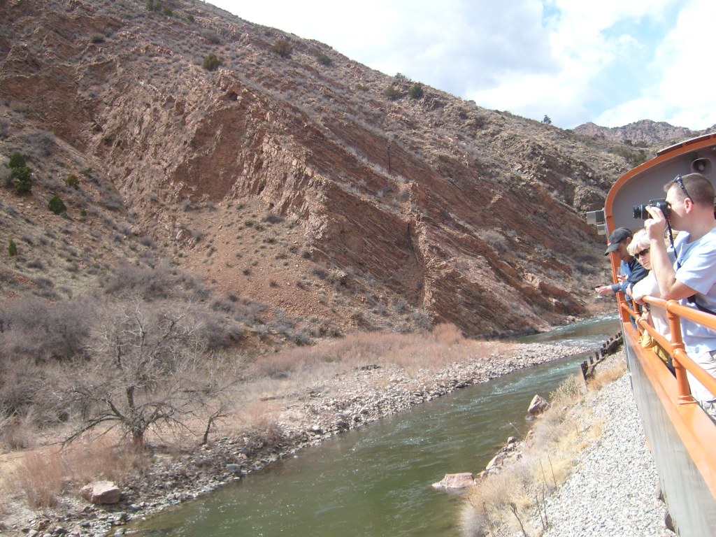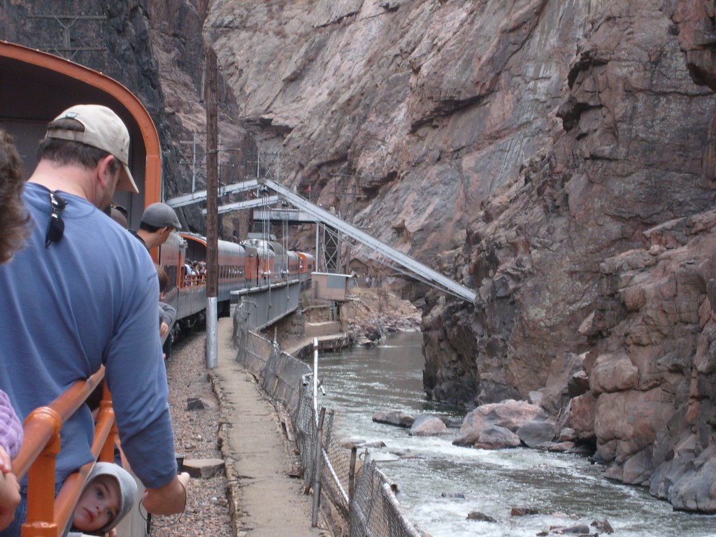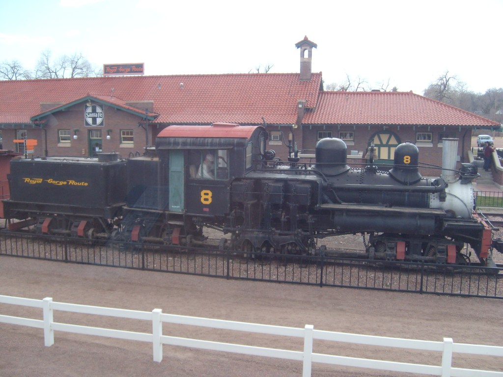 During the Spring of 2013, I took some family for a ride on the Royal Gorge Railroad. The ride begins at the Cañon City, Colorado railroad station. From there, it travels the length of the Gorge (upstream), then reverses direction and comes back down the Gorge. The rail journey ends in the same place it began, which would be here: