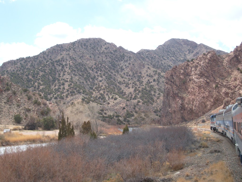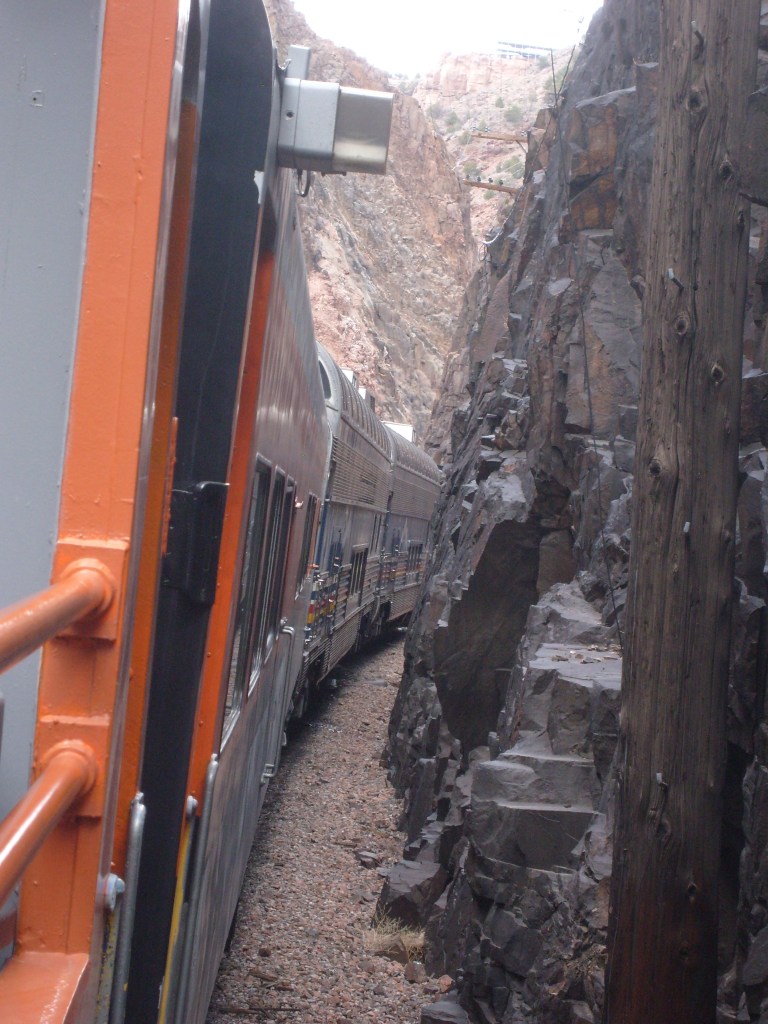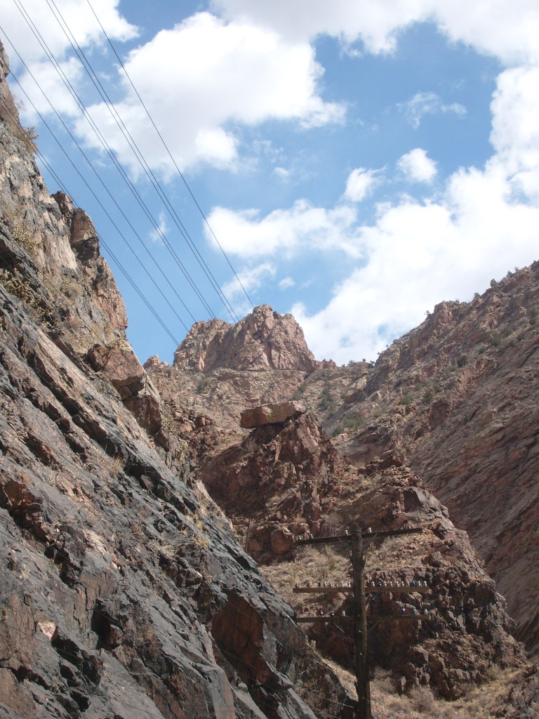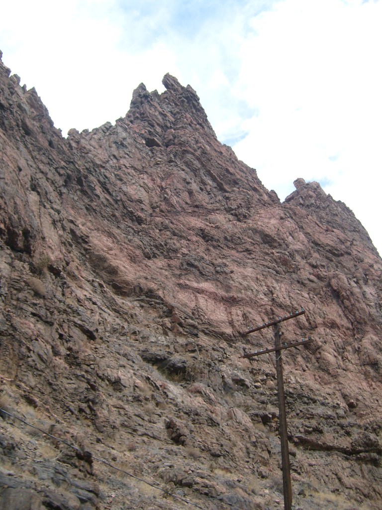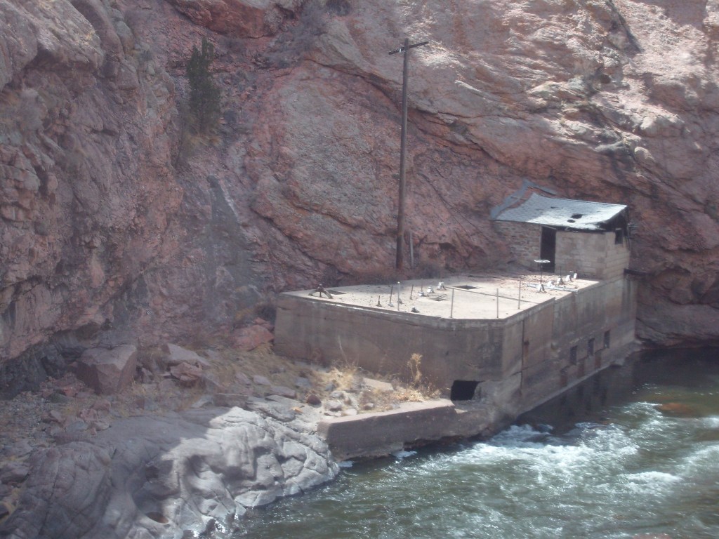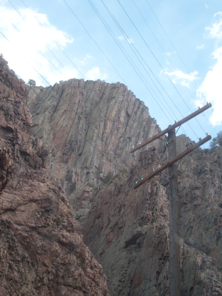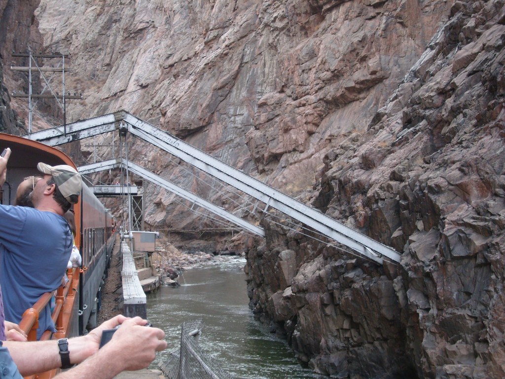 Leaving the station, headed for Royal GorgeWe have entered Royal Gorge! Yes, parts of Colorado are actually this dry.Believe it or not, this is the Arkansas River.I’m guessing this building had to do with the old aqueduct (more on that later).They forgot to turn the waterfalls on.Man, Barbra Streisand has really let her place go!Intriguing rock layer at the base of the canyon wallThis bridge was part of a 19th century aqueduct. It supported a wooden pipe.This power pole reminds me of Jack from “The Muppet Movie”.They got creative with the support structures for the old aqueduct.The horizontal line is the Royal Gorge suspension bridge.