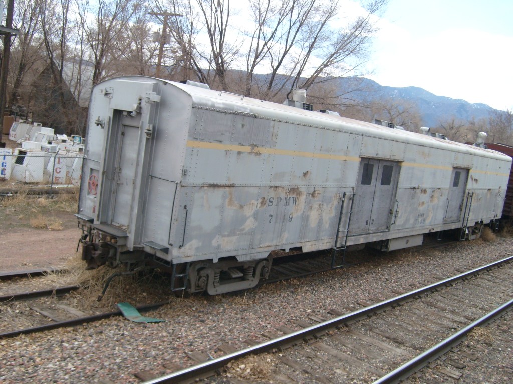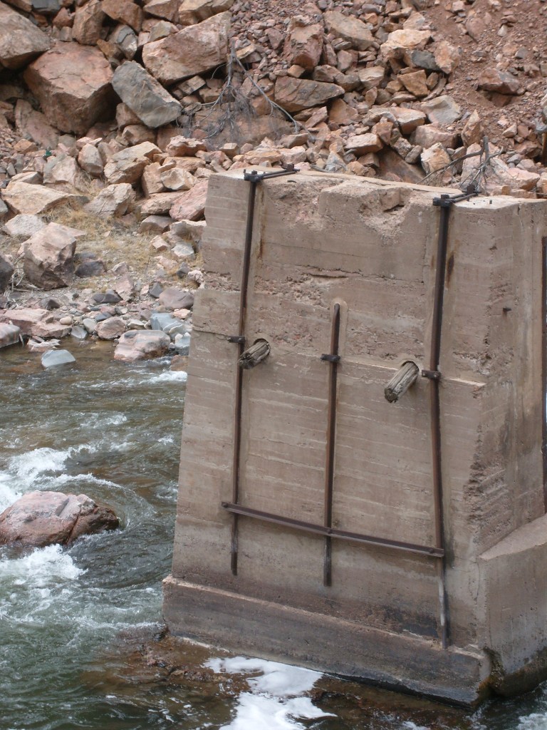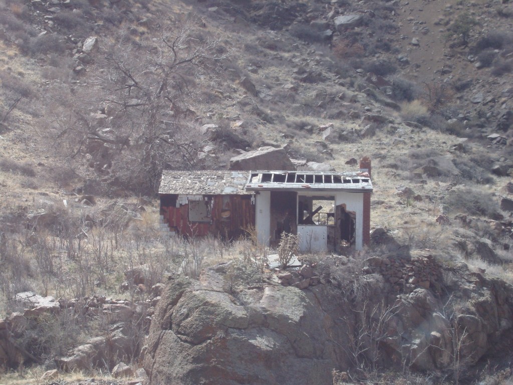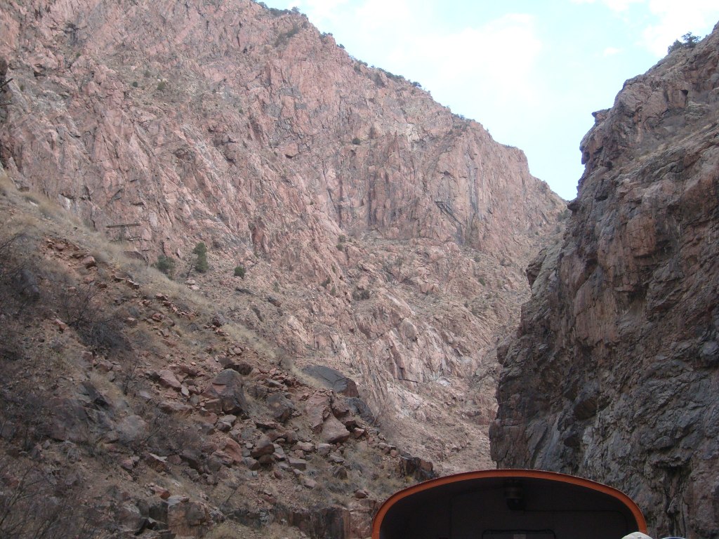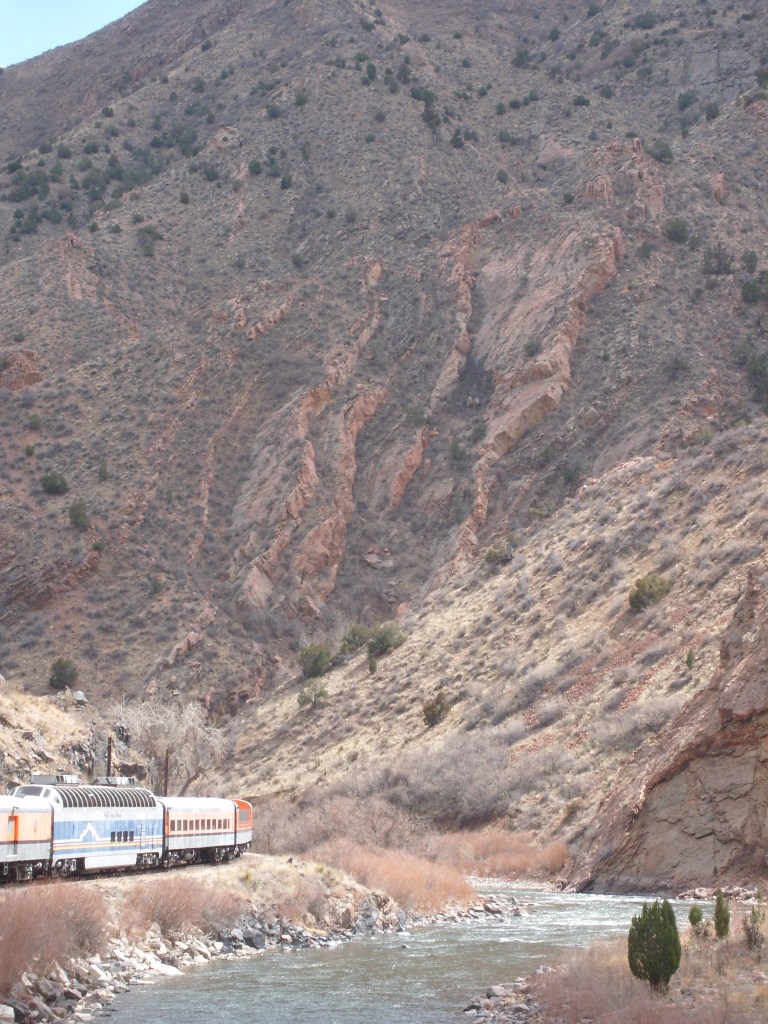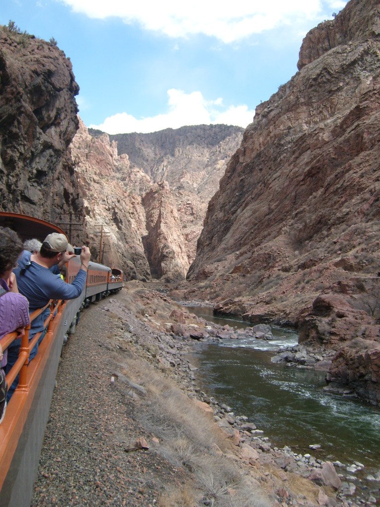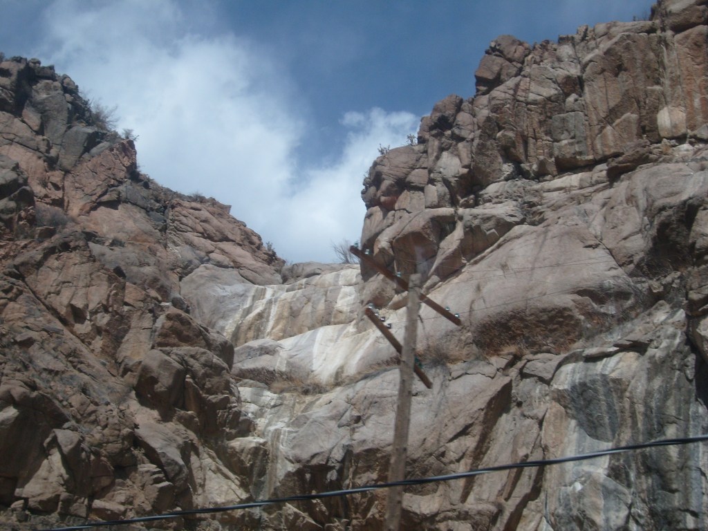 Leaving the station, headed for Royal GorgeWe have entered Royal Gorge! Yes, parts of Colorado are actually this dry.Believe it or not, this is the Arkansas River.I’m guessing this building had to do with the old aqueduct (more on that later).They forgot to turn the waterfalls on.Man, Barbra Streisand has really let her place go!Intriguing rock layer at the base of the canyon wallThis bridge was part of a 19th century aqueduct. It supported a wooden pipe.This power pole reminds me of Jack from “The Muppet Movie”.They got creative with the support structures for the old aqueduct.The horizontal line is the Royal Gorge suspension bridge.