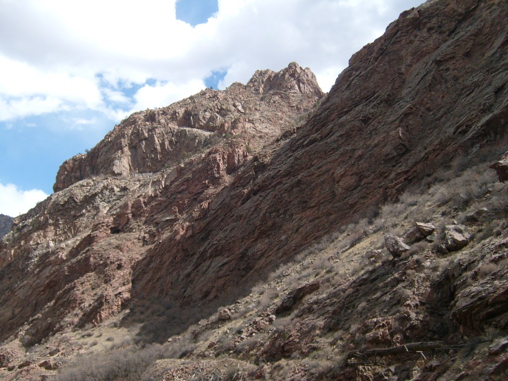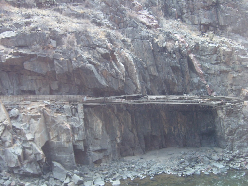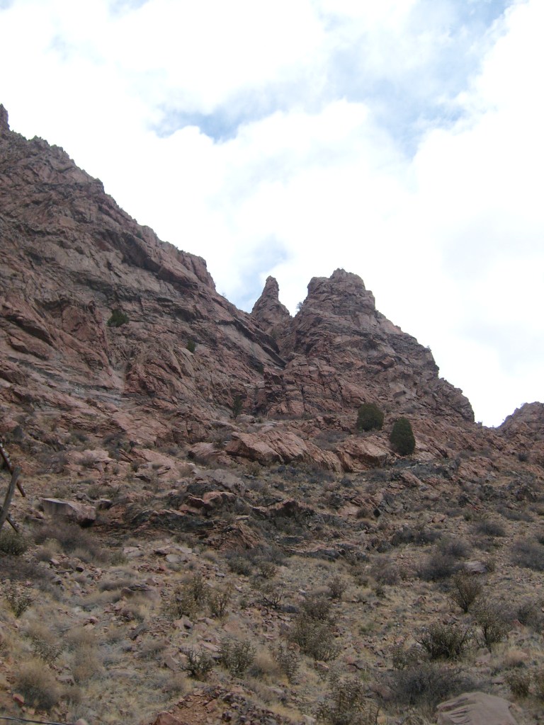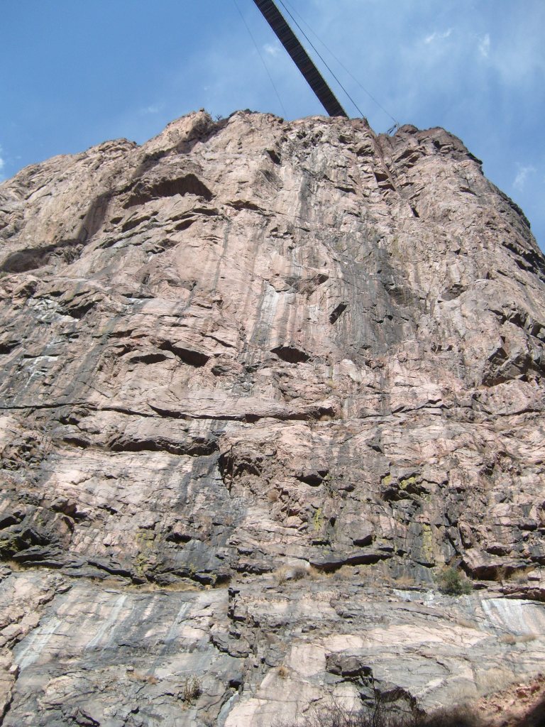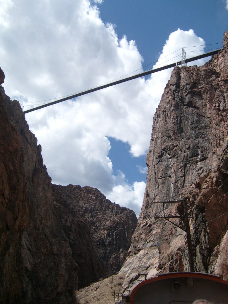 …gave us a better feel for how tight the gorge is in some spots.More of the 19th Century aqueductCurses! Photobombed by the disembodied head of a small child!They got creative with the supports for the railroad line, too.Looking up at Royal Gorge bridge. Yes, the road (deck) is made of planks.This was the world’s highest suspension bridge when built in 1929.More of the old aqueductI’m not sure, but I think this bridge pier was part of the old aqueduct.This appears to be a much more modern aqueduct.Cholla! Yes, there are parts of Colorado that are supposed to be this dry.Crazy cool rock layers in the canyon wallI found these black streaks in the rock to be especially curious.