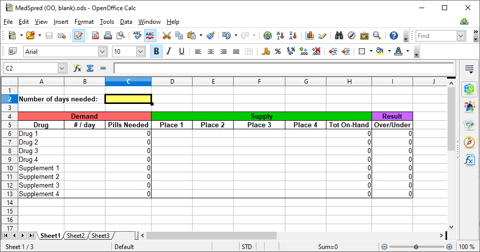 Start by typing the names of all your medications and/or dietary supplements into the “Drug” column under the red section. If you need to add more lines for more meds, you should be able to add lines normally. The formulas should be entered automatically, so your new row should have zeroes in columns C, H, and I. Now, in Column B under the Red “Demand” section, enter the number of pills you take per day, for each medication / supplement.