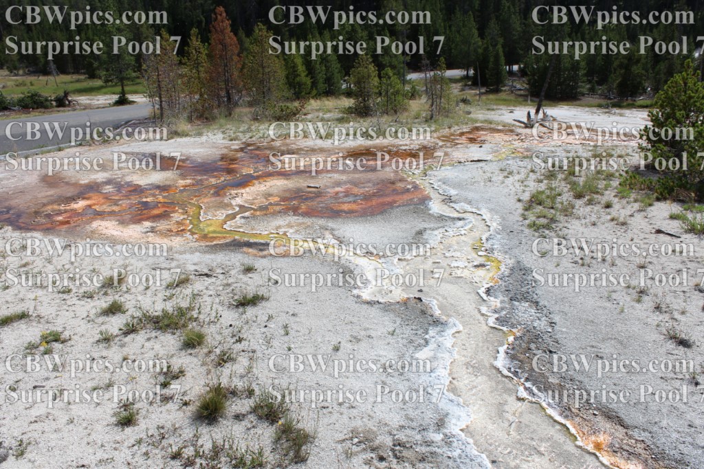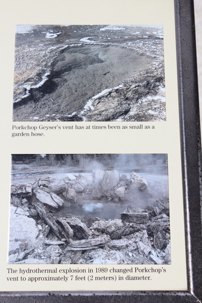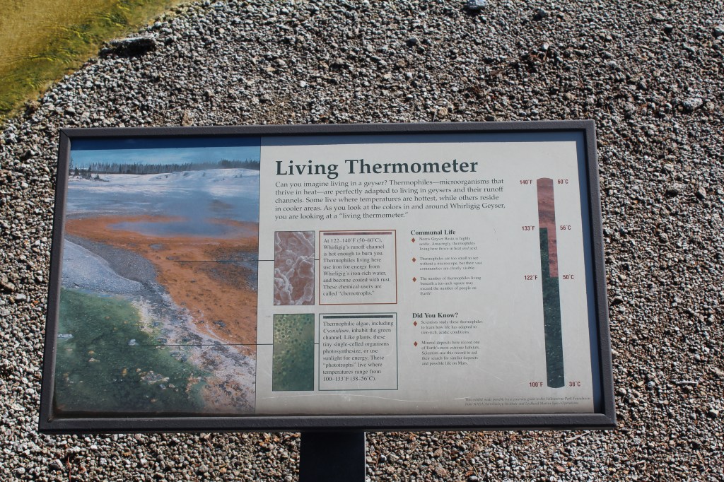 Emerald SpringThis one is named Fearless Geyser. But I think it’s secretly afraid of spiders.A serious amount of steam comes out of this little fumarole.Green Dragon SpringA small eruption from Minute GeyserMonarch Geyser CraterYellowstone isn’t just canyons and geyser basins – there are mountains, too!Porkchop Geyser has an interesting story. In 1989 it hurled rocks at park visitors!What Porkchop Geyser looks like nowAn interesting-looking pair of (I think) unnamed featuresNot sure of the name of this feature (or whether it even has one).I think this is an amaretto spring. I didn’t taste it to find out.Veteran GeyserWhirligig Geyser’s runoff channels and……an explanation of the colors therein.Whirligig Geyser’s runoff channels