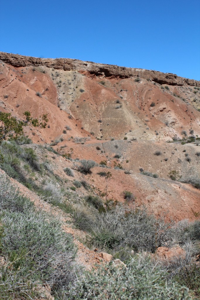 Why do I point out the path along the crest? Because I was dumb enough to try it out! I must say, I don’t recommend it. Running down the red hill, I felt like I could lose control at any second, and wind up bouncing down the hill. But I made it down safely and proceeded up the crest of the next hill (they get progressively smaller). When I reached the downslope on this one, I tried squatting and sliding my feet down rather than running. This felt safer, but still was pretty iffy. The third and final descent was the shortest, but probably also the steepest. The squatting approach worked well, and put me on top of a flat rock. From there it was a simple hop down to a flat area less than a foot below. Somehow, I hosed this up. I went for a bit of a tumble, but neither I nor my camera were harmed. I’m just damn lucky there was no vegetation (i.e., cactus) on that bottom flat area.