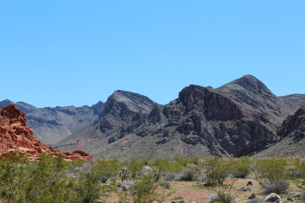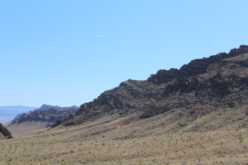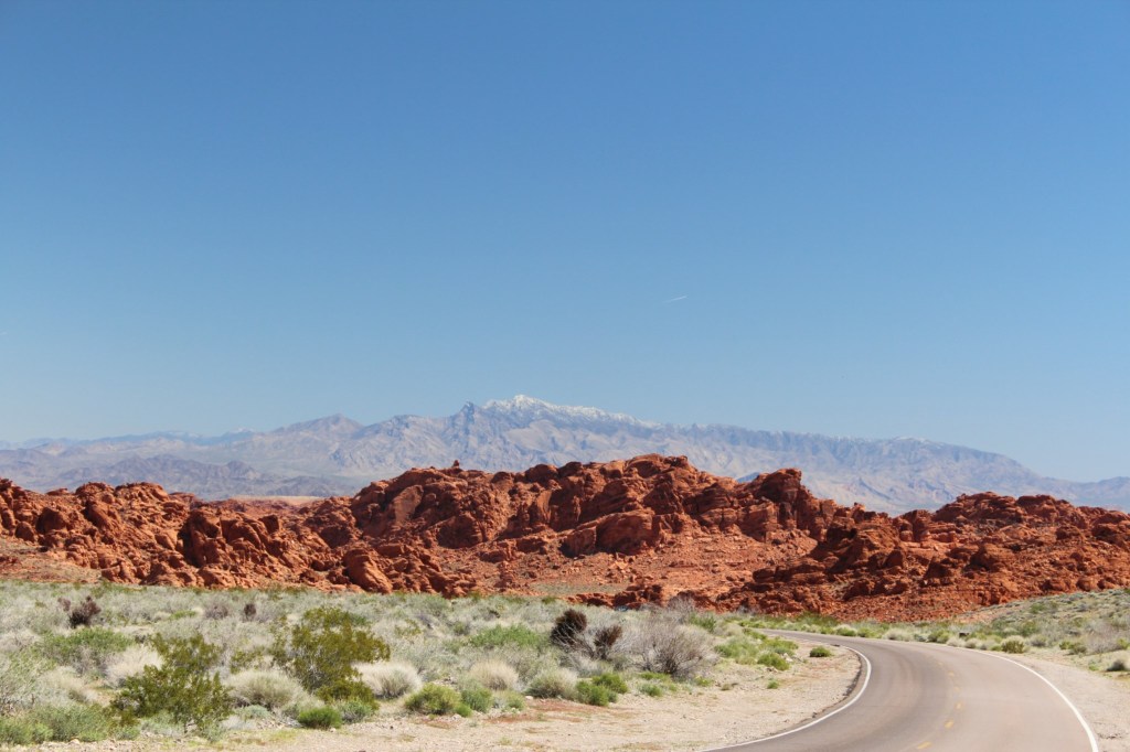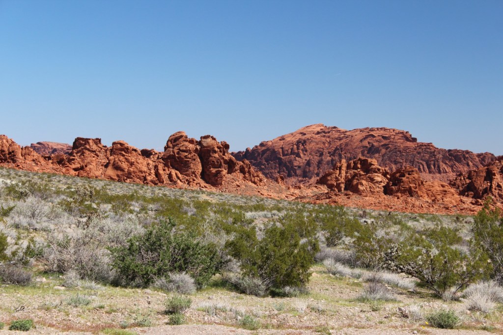 Now I’ll have to watch that movie again when I get home. But yes, on this day I am leaving the big city for the smaller towns and more remote desert parks and such. I am beginning with Valley o’ Fire State Park. I’ve only seen a couple of photos of this place, but it comes highly recommended. Just outside Vegas, Interstate 15 Northbound is reduced from three lanes to one lane, so I am stuck amidst merging semi’s for quite some time. But I left the hotel early, so I’ve still got the whole day ahead of me. I make it to the official park boundary, and am immediately treated to the scenery below: