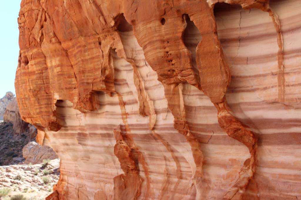 As mentioned above, I’ve only seen a couple of photos of this place, so I’m not really sure what to expect. With a name like “Valley of Fire”, I’m thinking red rocks. I’m thinking various shades of maroon and maybe some dark orange. Something along the lines of Red Rock Canyon (either the one near Vegas or the one near Colorado Springs) or Red Rocks Amphitheater near Denver. WRONG! Instead, I was greeted by the most brilliant orange I’ve ever seen in rocks. Truly, this is deserving of the word fire! For my old Adventureland buddies…these rocks are even more orange than our old unforms! Check ’em out:
