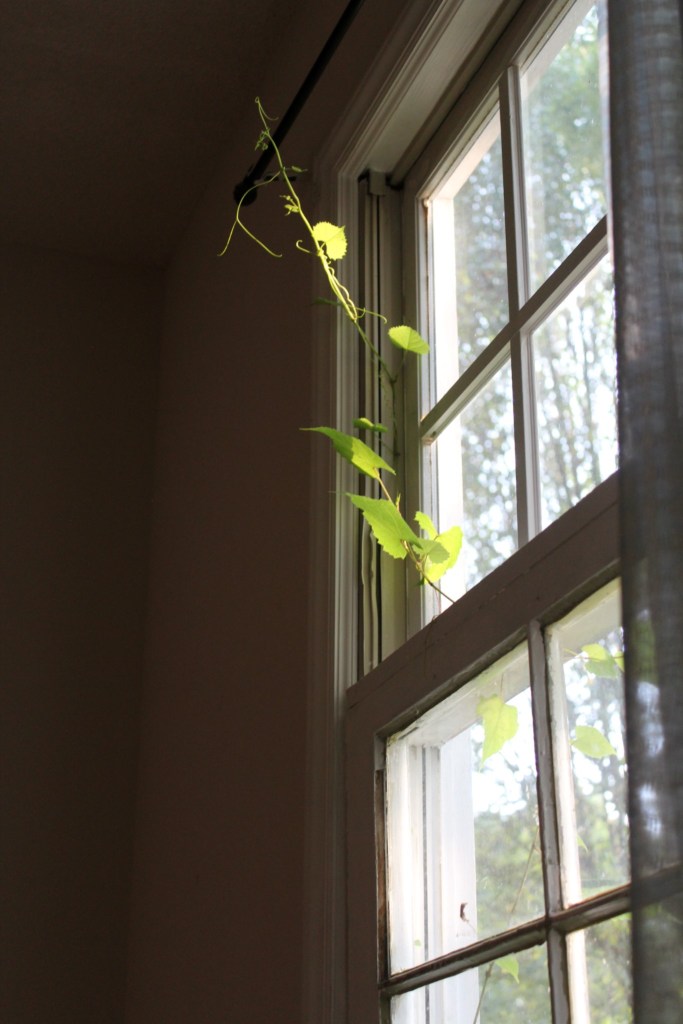 Yup. A vine that is trying to completely cover a bush just outside the window has actually found its way INTO THE HOUSE. It managed to squeeze in through a tiny gap where the two window frames come together (when the window is closed). What are the odds? Seriously, what are they? Now that I know the outcome, I might use the Way-the-Hell-Back Machine to go to Vegas and place a bet on it. Come to think of it, why am I not already using my Way-the-Hell-Back Machine for sports betting? I need to get my priorities straight.