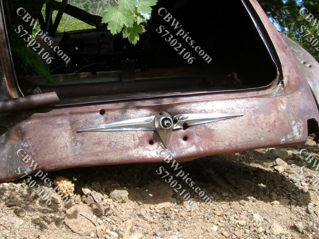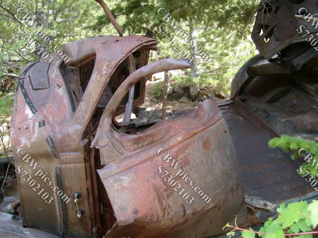 At this point, I encountered The Mystery Car. This poor old thing appears to have tumbled a LONG way down the mountainside…but from where? At this point, I had circumnavigated this mountain and was unaware of any road located uphill from here. As I write this, 14.5 years later, I have just discovered mapcarta.com. This site reveals a road called Sawmill Gulch Loop, which passes about 330 vertical feet uphill from The Mystery Car. So, mystery (partially) solved. Here’s the ill-fated car anyway…