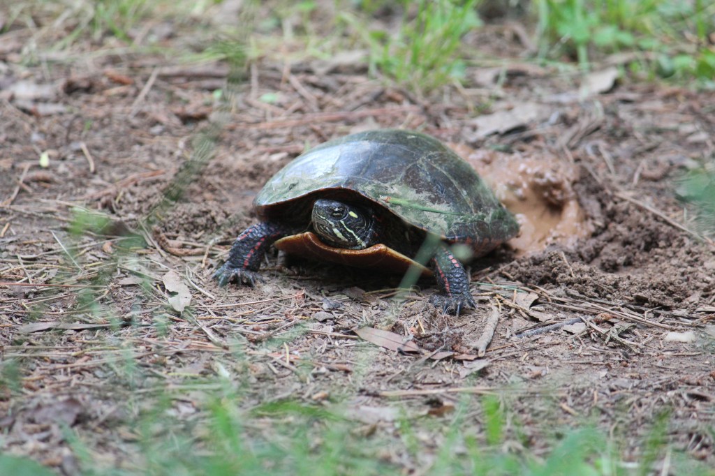 When writing this blog, I am usually sitting at the computer desk in my living room, which is right next to a window overlooking my back yard and Ballard’s Pond. Not long ago, I glanced out this window to find that this little lady had crawled up from the pond and was laying eggs in my yard:
