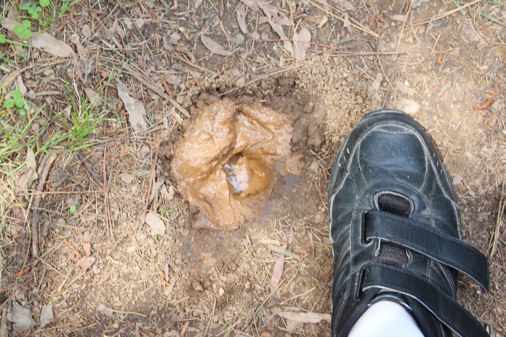I snapped the picture above through the window, then had some lunch, intending to go outside and get more pictures after I ate. But before I was done eating, she had already meandered back down to the pond. I went outside anyway, to get this picture of the nest and a foot o’ mine, to show how small this turtle is. Note that the mama turtle buries the nest and its eggs in mud, which is why you can’t see actual eggs in this picture.
