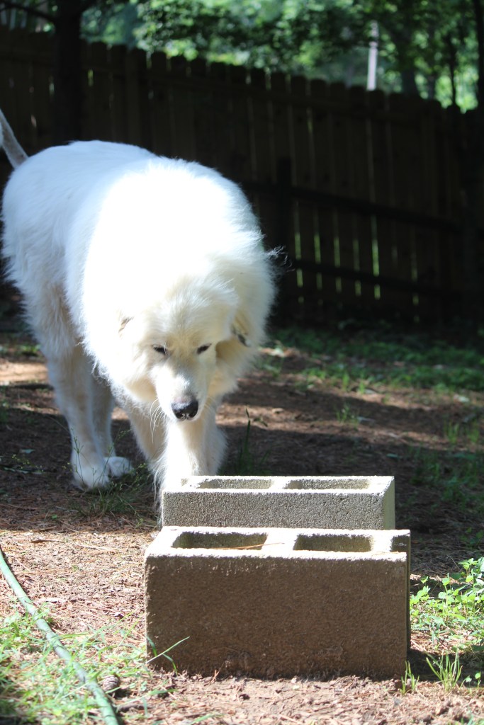 On her quest to establish a nest, mama turtle had crawled uphill until she got to the first sandy spot she could find, which turned out to be the “patrol trail” that Bear has worn down by repeatedly running from one side of the yard to the other. So, to protect the nest from Bear’s trampling, I erected barricades on either side of the nest, as shown below: